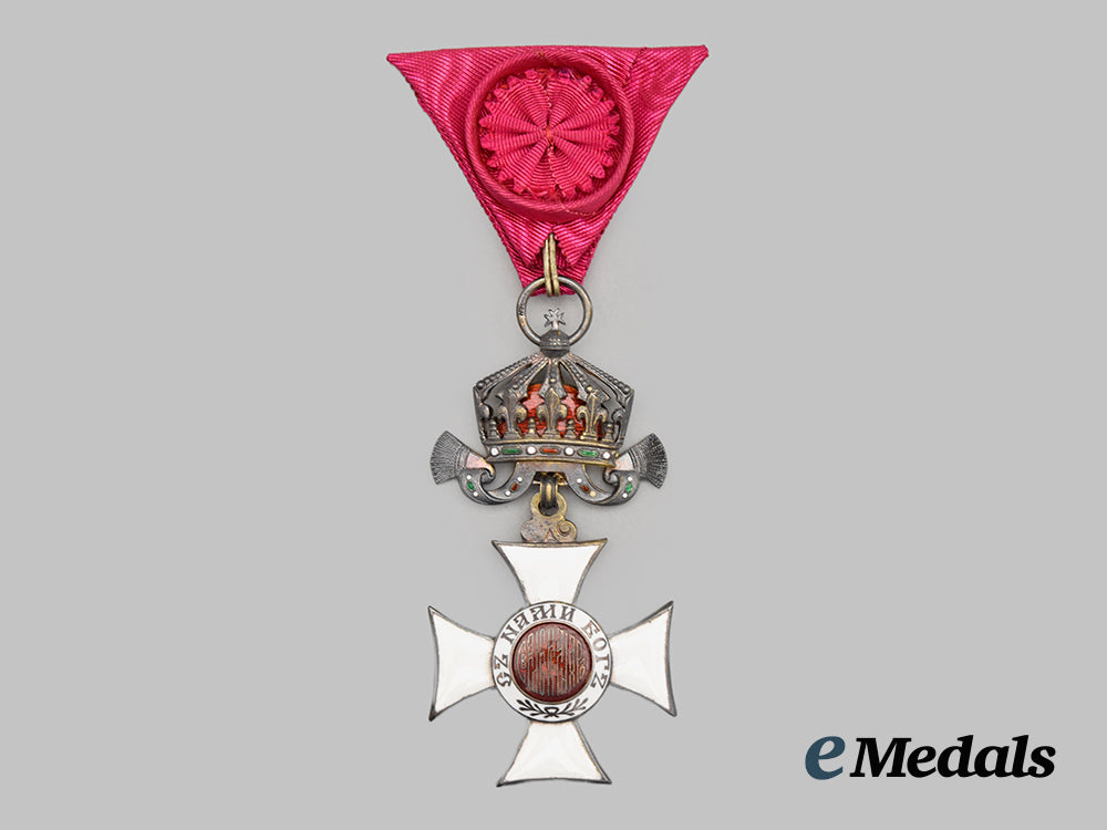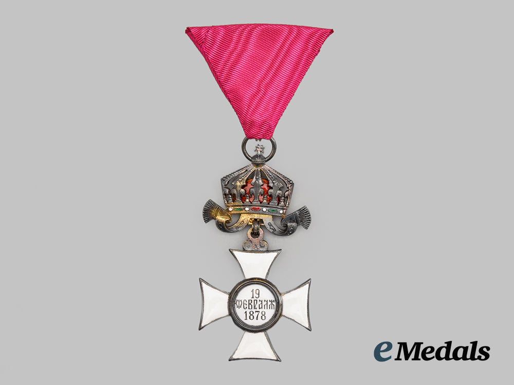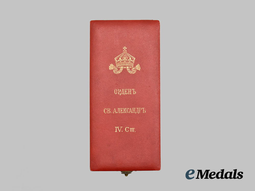 Instituted in 1881. In silver with red and white enamels, cross in white enamel, obverse centrepiece shows stylized inscription with the name of the order surrounded by a ring with the inscription “СЪ НАМИ БОГЪ”, reverse shows the date “19 ФЕВРАЛЪ 1878” on a white background, inclusive of royal crown suspension 75.7 mm (h) x 39 mm (w), on triangle ribbon with rosette, near mint condition. Housed in its hardshelled case of issue, deep red exterior with black bottom, lid marked with the Imperial crown surmounting the monogram of Tsar Ferdinand I and inscribed "ОРДЕНЪ СВ. АЛЕКСАНДРБ IV. СТП." in gold-coloured ink, 137.4 mm (l) x 63 mm (w) x 26.2 mm (h), very fine condition.