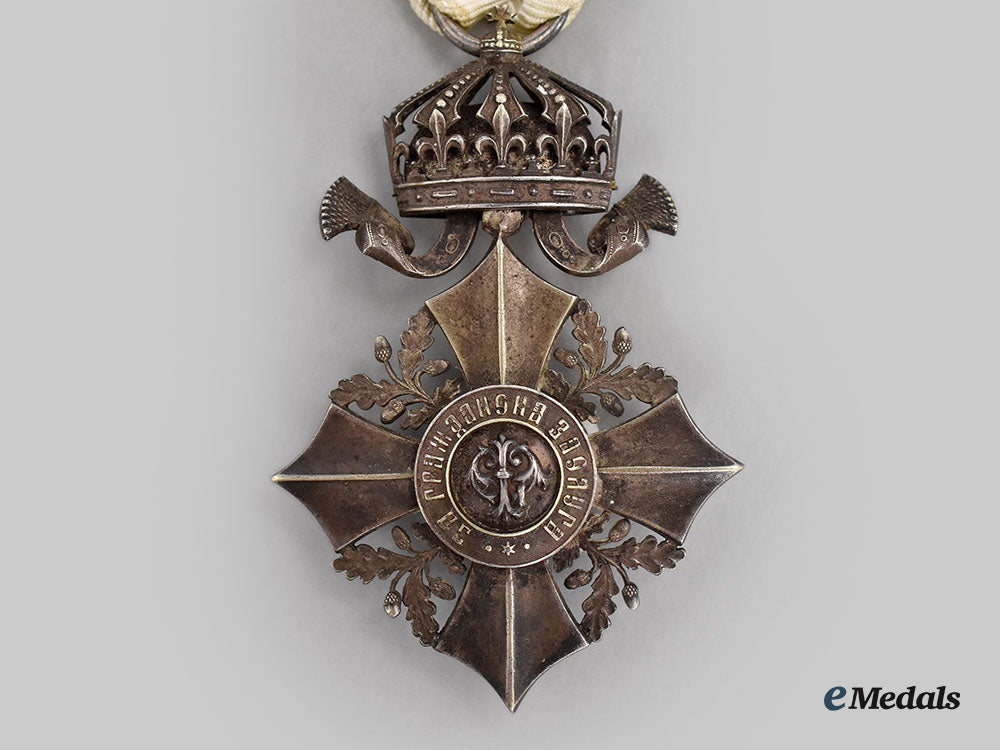 1. National Order for Civil Merit, VI Class Merit Cross, Type II with Imperial Crown (1908-1944) (ОРДЕНЪ ЗА ГРАЖДАНСКА ЗАСЛУГА III CТП). Instituted in 1891: multi-piece construction, in silver, unmarked, measuring 45.5 mm (w) x 68.5 mm (h) inclusive of its Imperial crown suspension, original ribbon with paper residue evident on the reverse from previous board mounting.