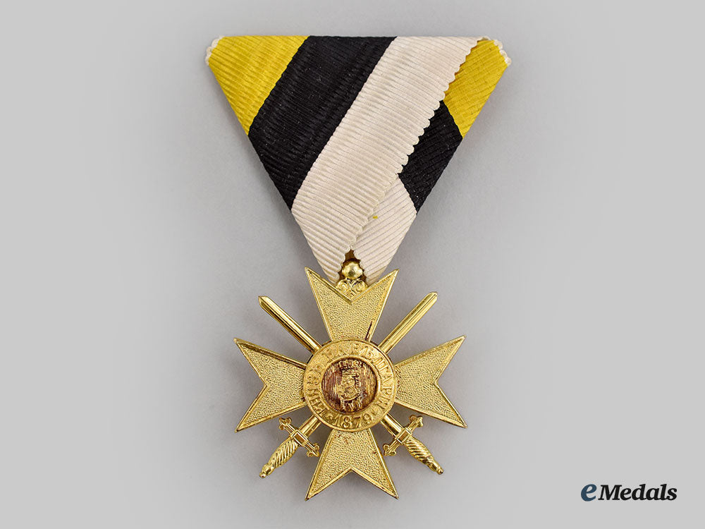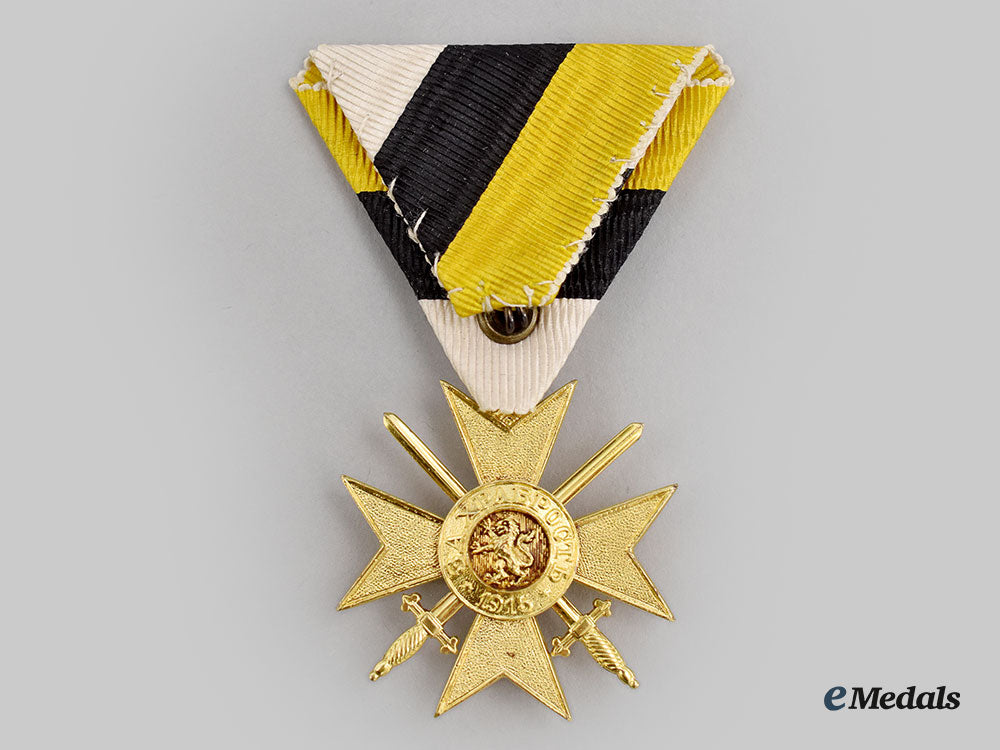 2. Military Order of Bravery, Type III with the date 1915, II Class Soldier's Cross for Bravery (Военен орден за храброст). Instituted in 1880: three-piece construction, in bronze gilt, unmarked, measuring 39.7 mm (w) x 40.8 mm (h) inclusive of its laterally-pierced ball suspension, original triangular ribbon with hook and eye.