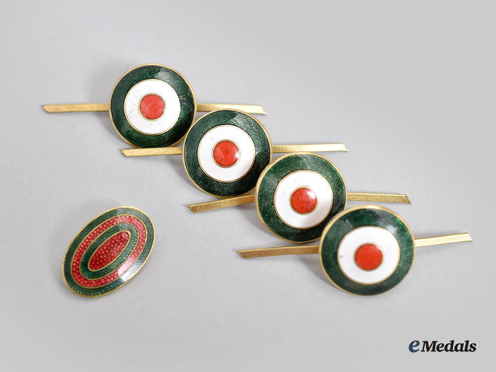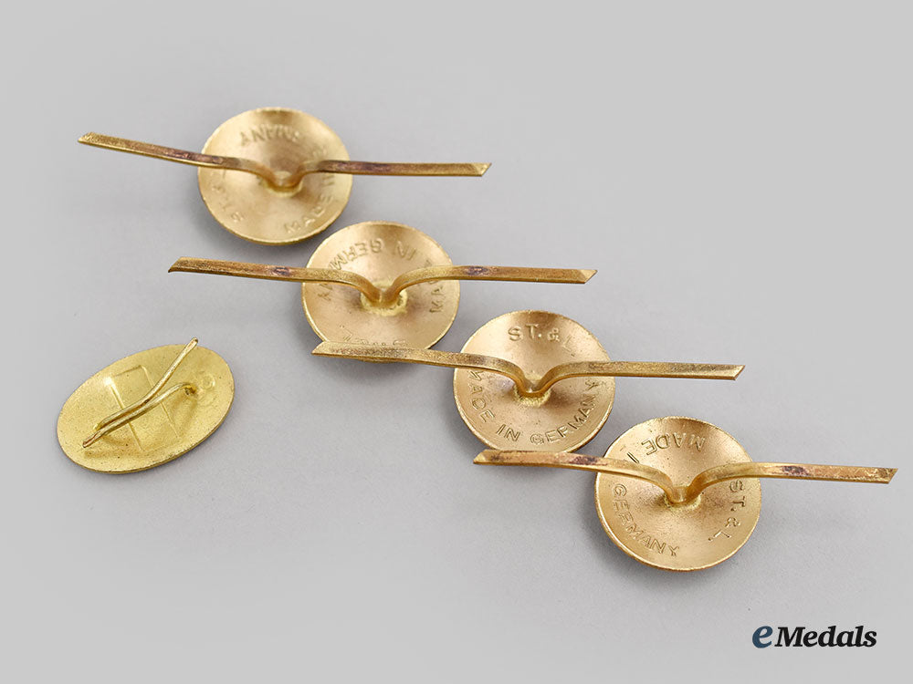 3. four Cap Badges: in bronze gilt with red, white and green enamels, maker marked "ST. & L." (Steinhauer & Luck, Lüdenscheid) and marked "MADE IN GERMANY" on the reverse, measuring 20.5 mm in diameter each, all four with both prongs and enamels intact.