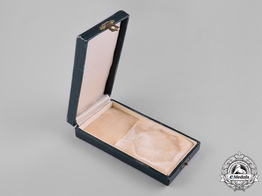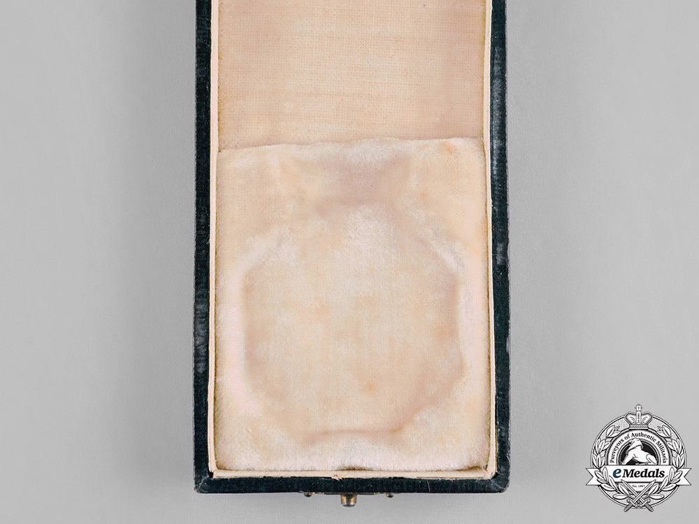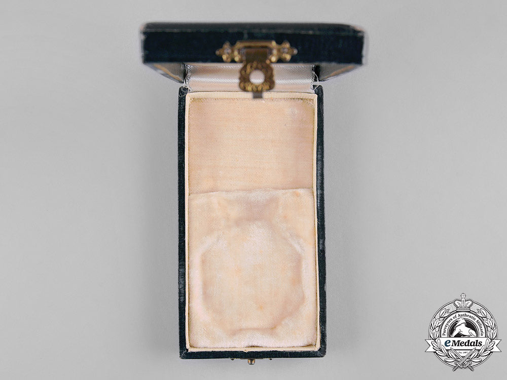 (Военна ордена на смелостта, Гранд Крос). Instituted in 1880. Hardshelled design on both the lid and base, the exterior with a forest green multi-ridged fabric covering on all sides, the lid bearing the cypher of Tsar Boris III (Reign: 1918-1943) surmounted by the Imperial crown and inscribed "ОРДЕНЪ / "ЗА ХРАБРОСТЬ" / IV. Степень. / II. Класъ" in gold-coloured ink, inside lid lined in white satin, a white cardboard insert placed within the base and housing a white felt recessed medal bed, single clasp closure, measuring 58 mm (w) x 108 mm (h) x 23.5 mm (d), light scuffing and wear on the exterior, the cypher of Tsar Boris III experiencing chattering in the ink, light soiling on the medal bed, very fine.