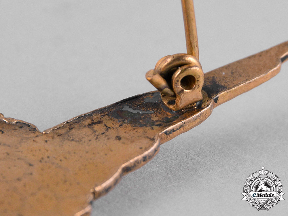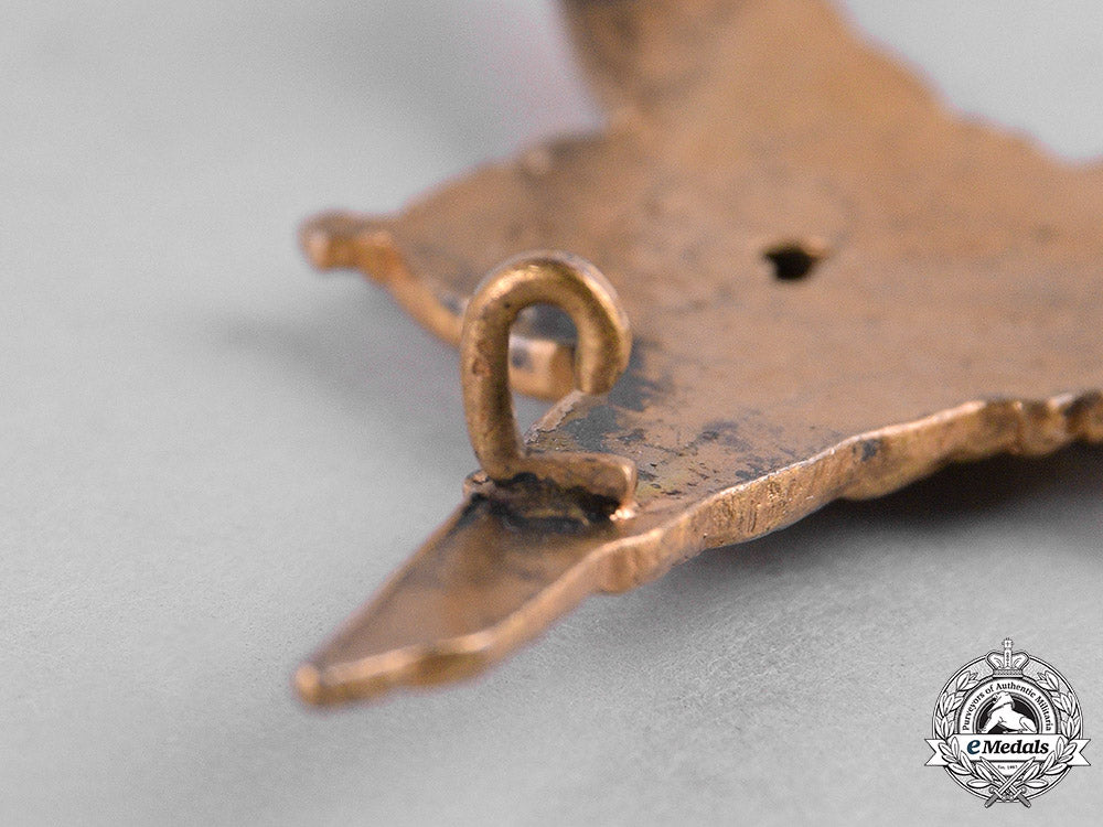 In bronze gilt, illustrating a spread-winged eagle, with the head passing through the crowned cypher of Tsar Boris III (reign: 1918-1943), measuring 61 mm (w) x 26.8 mm (h), horizontal pinback, extremely fine.