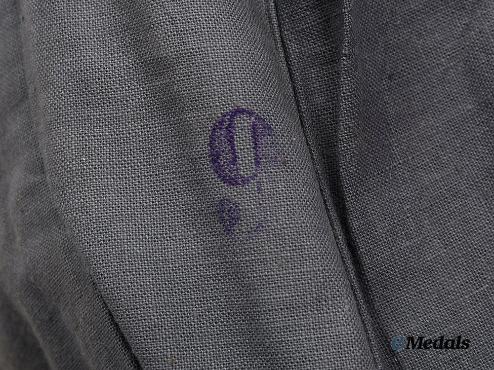 A very well-preserved Bulgarian Army Enlisted Man’s overseas cap, constructed of coarsely woven olive green fabric. The sides are sewn together using multiple panels, giving it the appearance of having fold-down panels, the right side with a tri-colour shield in the pattern of the Bulgarian National Colors sewn to the cap, while the front is decorated with a bronze, leftward-facing, rampant lion. The interior is lined in medium-grey fabric with a chocolate-brown leather sweatliner. It is marked “9” twice in blue ink. It is of medium size and besides some fading due to age and wear, is extremely well preserved.