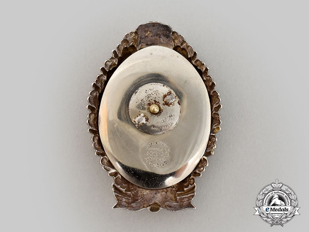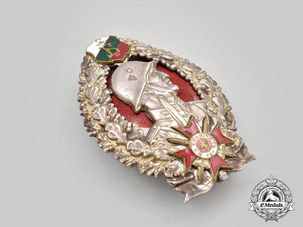 Four-piece construction, illustrating the monogram of Tsar Boris III (reign: 1918-1943) in bronze with red, green and white enamels at the top and the Military Order of Bravery in bronze with red and white enamels at the bottom, mounted to a silver base illustrating a helmeted soldier framed by an open-ended wreath of oak leaves, with a red enamelled plate showing through in the voided areas, marked in cyrillic type with the Straknil Miloshev of Sofia maker mark and coded "3-23-89" on the magnetic metal support plate and the magnetic metal screwback, measuring 39 mm (w) x 54.8 mm (h), intact enamels, very light contact, near extremely fine.