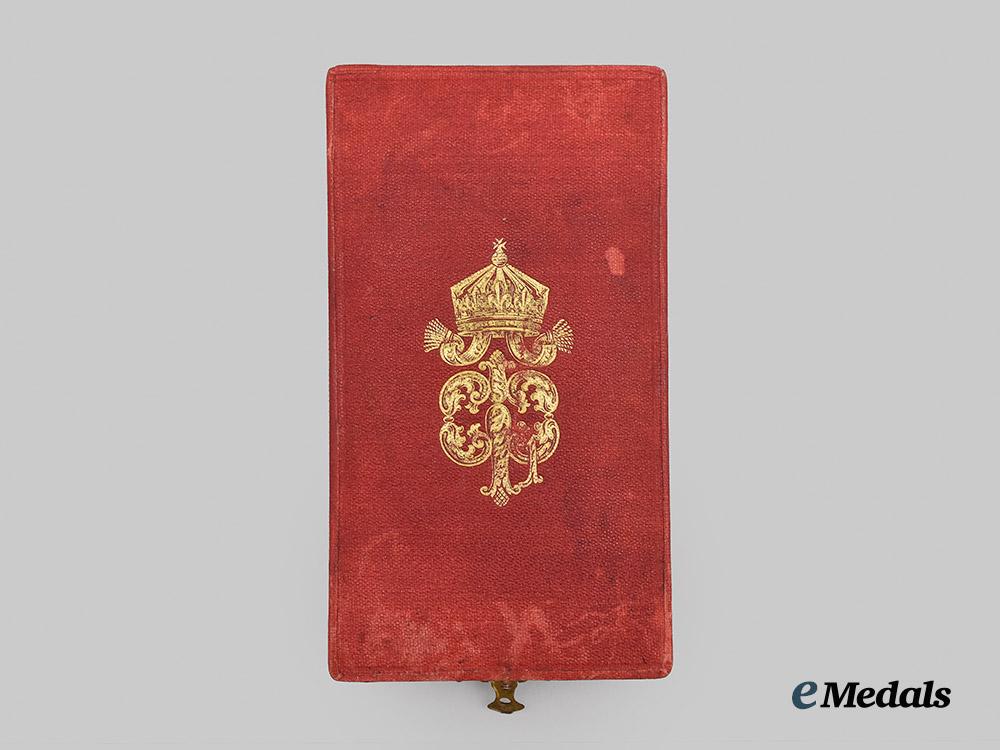 A silver Maltese cross featuring green enamels with white enamel border, centre cypher in gilt, reverse with institution date, measuring 35.8 mm (w) x 48.3 mm (h - inclusive of silver and enamel Roman Numeral suspension), on period triangular ribbon, with minor enamel loss to suspension, near extremely fine. In original case of issue, red exterior with black velvet medal bed, very fine.