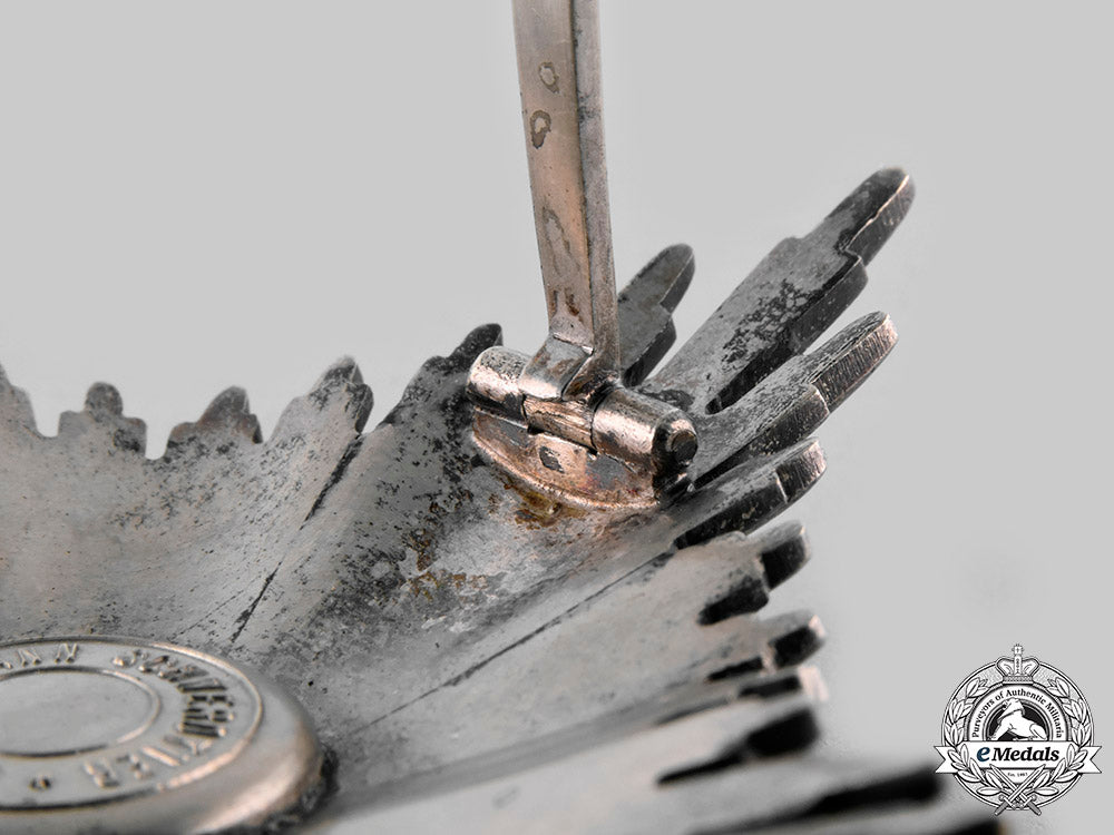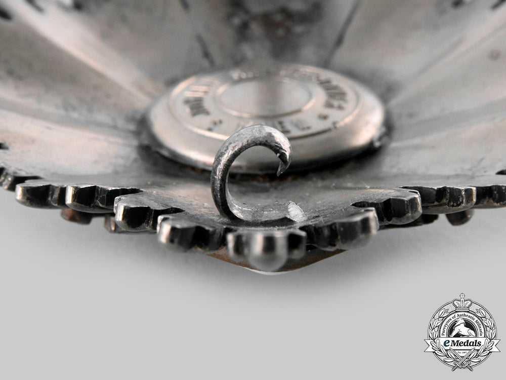 (Орден за гражданска заслуга). Instituted 1891. Type I. 1891-1906 Issue. A large and well manufactured multiple ray four armed star in silver, obverse presenting a four armed white enamelled Pison cross in bronze gilt, each quadrant embellished with detailed enamelled green laurel, with the central cypher backed by a red enamelled background, surrounded by the Cyrillic inscription 3А ГРАЖДАНСКА 3АСЛУГА (For Civil Merit) on a white enamel border, reverse presents a pin assembly and maker’s cartouche for Johann Schwerdtner Wien, measuring 94.02 mm (w) x 94.61 mm (h), weighs 70.9 grams, with slight enamel loss to central cypher and light overall wear, lovely patina, overall better than very fine condition.