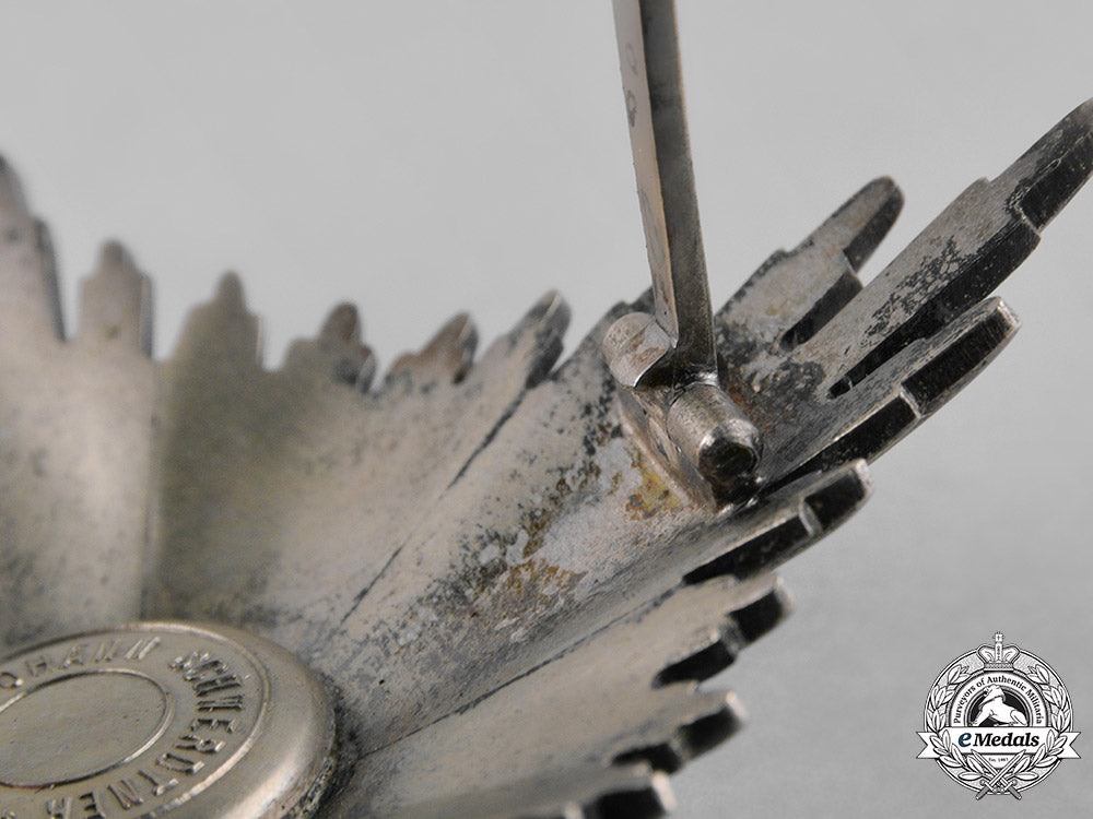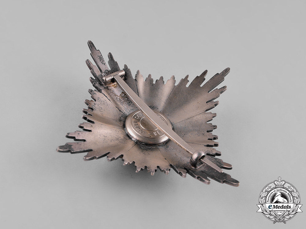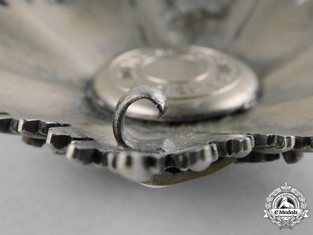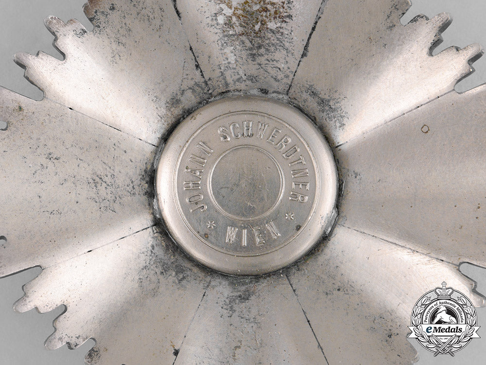 (Орден за гражданска заслуга). Instituted 1891. Type I. 1891-1906 Issue. An impressive and large multiple ray four armed star in silver, obverse featuring a four armed white enamelled Pison cross in bronze gilt, the quadrants embellished with detailed enameled green laurel branches also in bronze gilt, with central cypher backed by beautiful enameled red background, surrounding by Cyrillic lettering on a white enamel border, reverse with pin assembly and maker’s cartouche Johann Schwerdtner Wien, measuring 94.05 mm (w) x 94.76 mm (h), with enamel loss to central cypher and light overall wear, remains better than very fine.
