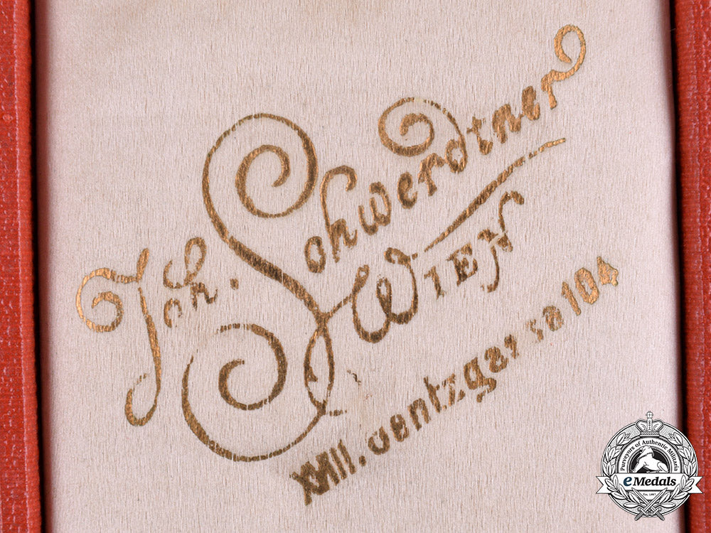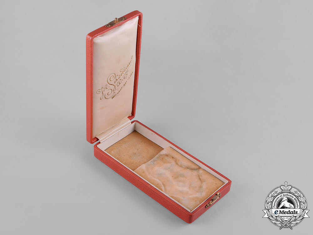 (Орден за Военна Заслуга). Instituted in 1900. Hardshelled design on both the lid and base, the exterior with a red pebbled fabric covering on five sides and a black thatched-look paper bottom, the lid bearing the Bulgarian coat-of-arms with the Imperial Crown and inscribed "ОРДЕНЪ / ЗА ВОЕННА ЗАСПУГА. / IV. CT." in gold-coloured ink, inside lid lined in white satin, padded and maker marked "Jon. Schwerdtner WIEN / XVIII.Gentzgasse 104", a white cardboard insert placed within the base and housing a raised platform in white felt with a recessed medal bed, single clasp closure, measuring 65 mm (w) x 132 mm (h) x 22.5 mm (d), very light soiling evident on the lid, one corner missing and scuffing on the black paper bottom, soiled medal bed, fine.