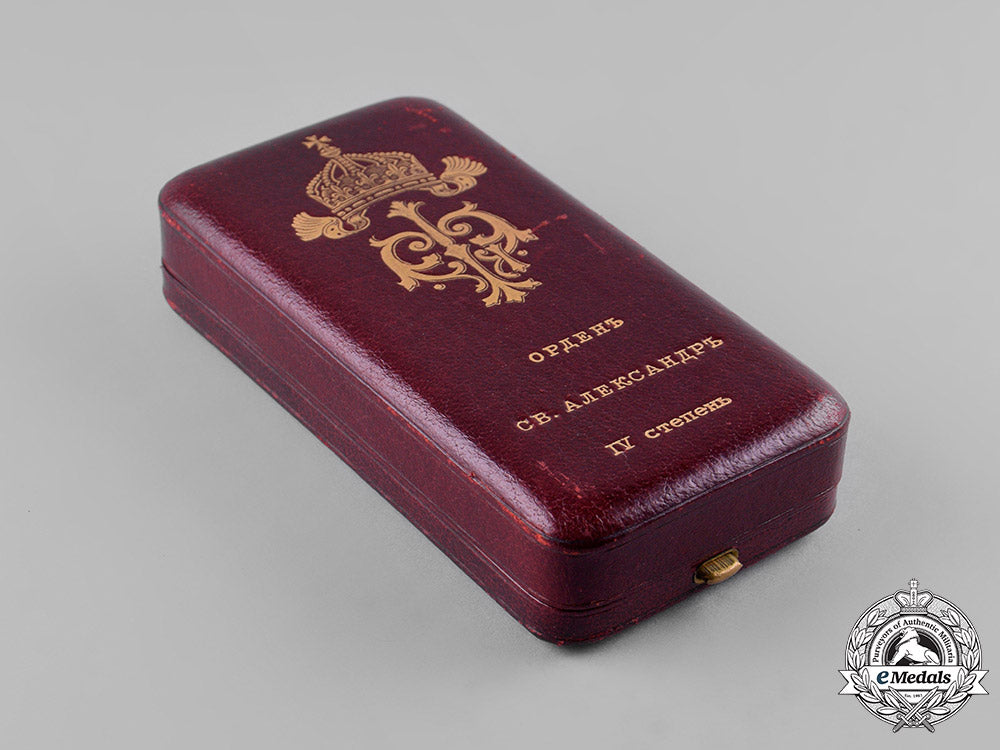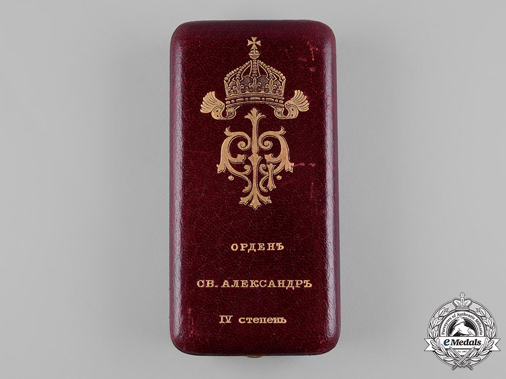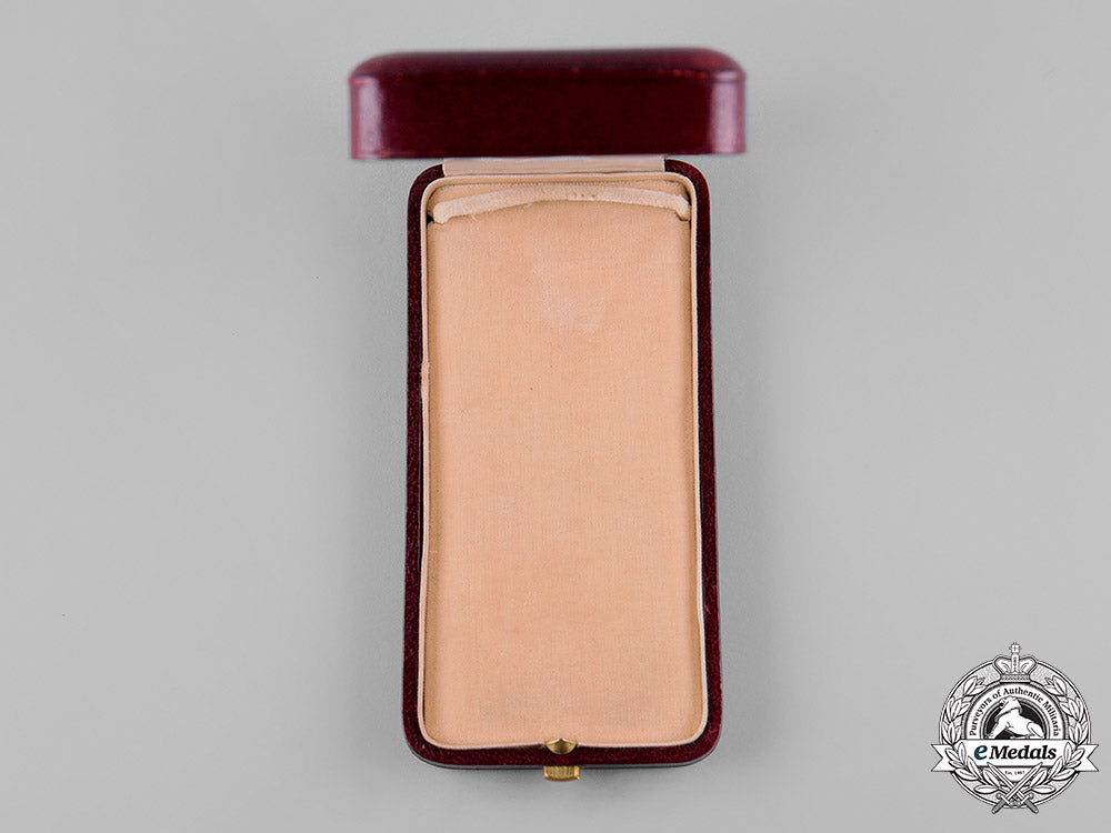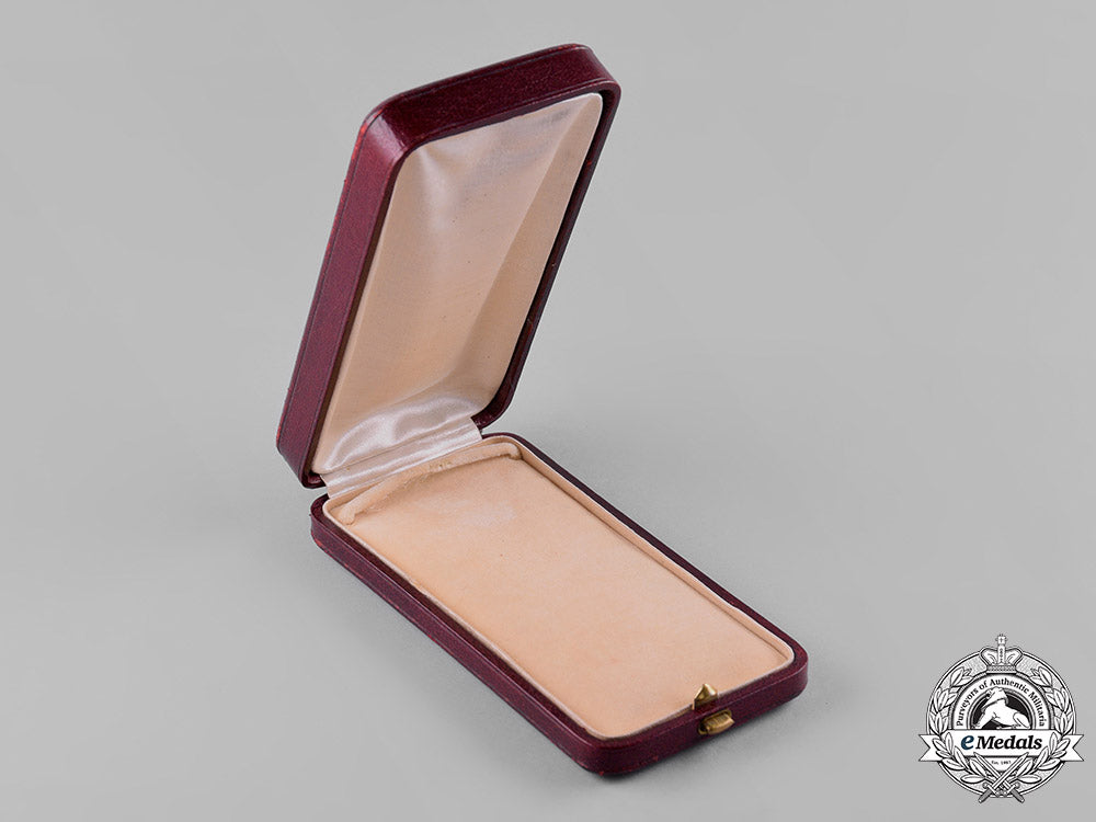 Instituted 19 May 1900. A presentation case for an Order of Military Merit, IV Class Officer’s Cross, constructed of a wood frame with a faux red leather exterior, the obverse lid with a gold embossed monogram of Tsar Boris III above a Bulgarian Cyrillic inscription of “Орденъ за Военна Заслуга” (“Order of Military Merit”), in turn above a laurel and oak leaf wreath, the interior with a white satin-type lid liner, with a partially intact hinge cover and a depressed white doeskin medal bed, opening with a functional bronze snap button, with a functional magnetic metal hinge, unmarked, measuring 68 mm (w) x 134 mm (l) x 22 mm (h), the lid has separated from the body of the case and there is minor material fatigue evident, in fair condition.