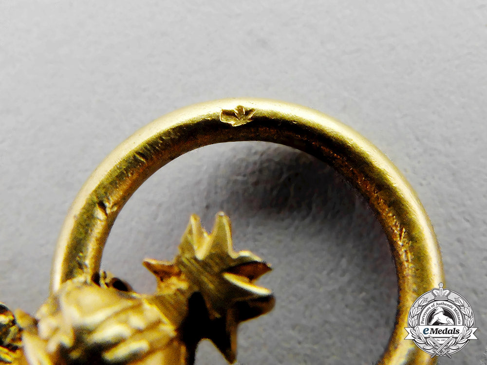 In bronze gilt with red, white and green enamels, measuring 50 mm (w) x 78 mm (h- inclusive of its crown suspension), with green enameled war decoration, marked with star on ring, with enamel loss to obverse 3 o'clock arm, fine.