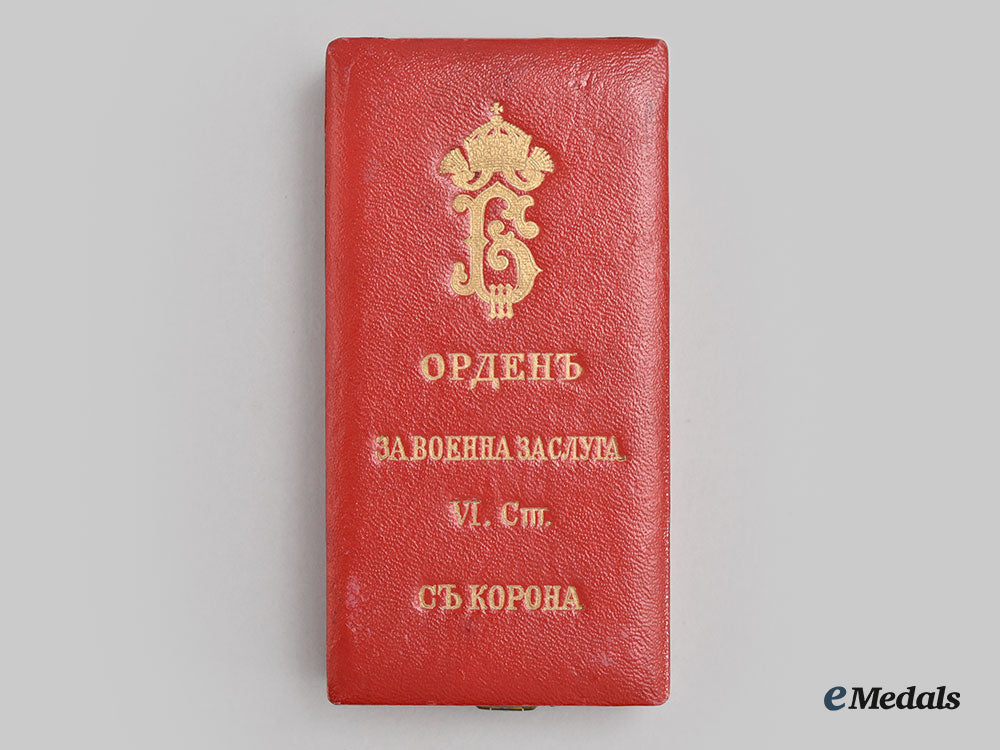 (Орден за Военна Заслуга). Instituted in 1900. Type I with Imperial Crown. The badge with a three-piece construction, in frosted silver, the badge surmounted by the Imperial crown in silver, measuring 46 mm (w) x 73.7 mm (h) inclusive of its Imperial crown suspension, original triangular ribbon with hook and eye, extremely fine. In its hardshelled case of issue, red dimpled exterior, the lid marked with the Imperial crown above the monogram of Tsar Boris III (reign: 1918-1943) and inscribed "ОРДЕНЪ ЗА ВОЕННА ЗАСЛУГА VI. CТП. СЪ КОРОНА" in gold-coloured ink, inside lid lined in a off-white synthetic material, padded and exhibiting the impression of the award, white cardboard insert placed within the base and incorporating a recessed medal bed in black felt, measuring 67 mm (w) x 130.5 mm (h) x 24.5 mm (d), light scuffing evident on the bottom, case better than very fine.