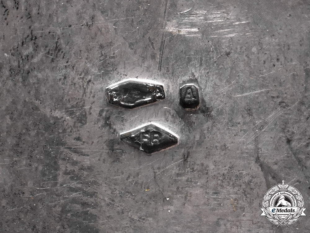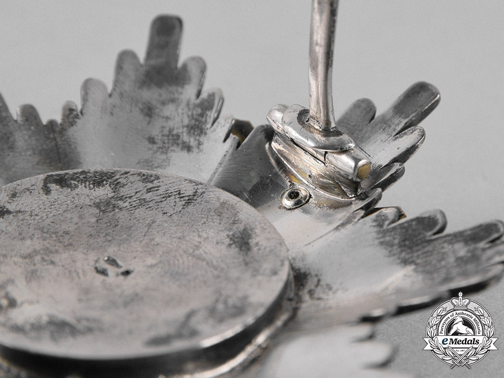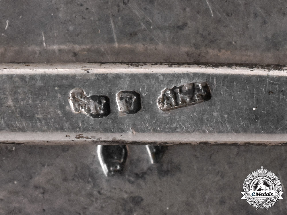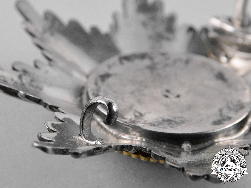 Instituted 1881. Type II. Military Division. A silver star consisting of eight arms composed of clusters of seven smooth armed rays, obverse centre presenting the stylized inscription with the name of the order on red enamels, the surrounding ring there was the motto СЪ НАМИ БОГЪ (God with us) with laurel wreaths below, gilt crossed swords affixed at 12 o'clock, reverse with central pin assembly, maker marked on back plate FR for Rothe, as well as "3 Hounds Head A" denoting small silver post 1867, "A" silver hallmarked, also marked AA on pin, as well as Dutch import/duty mark "vreemd" for objects used between 1906 and 1953 and AKA, measuring 81 mm (w) x 80.5 mm (h), extremely fine.