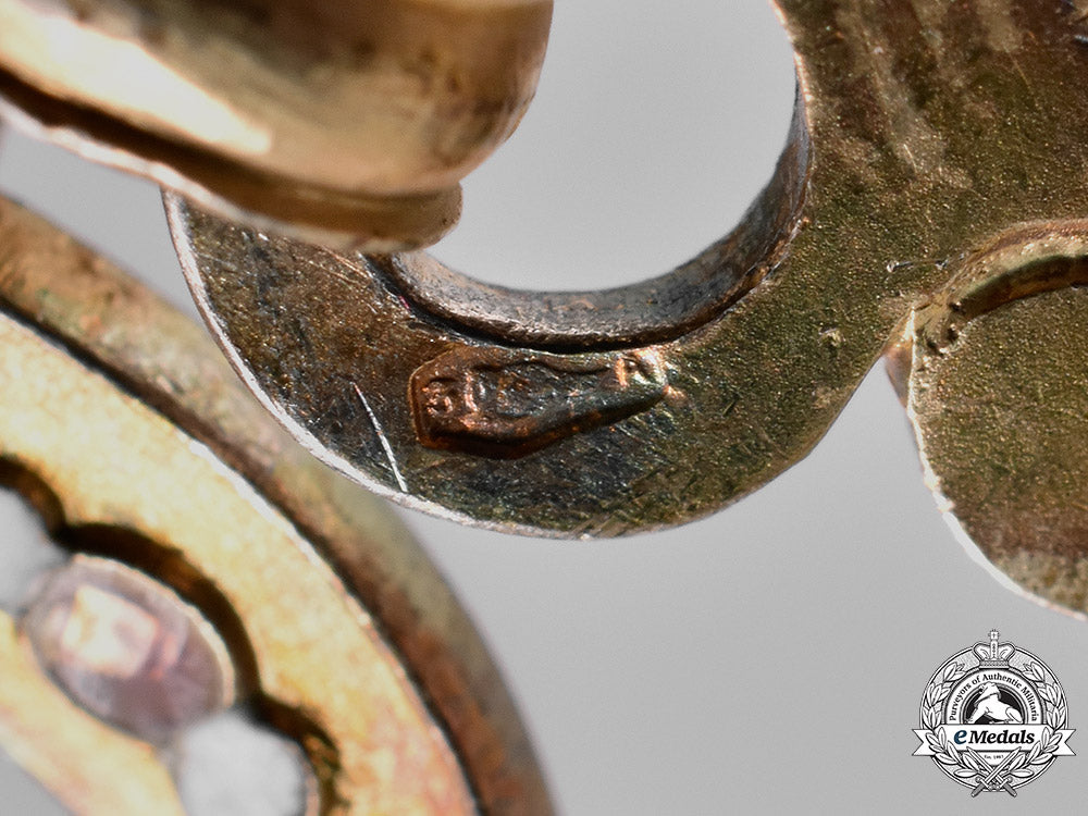 (Орден ""Свети Александър""). Instituted in 1881 by King Alexander I. Type I. 1890-1908 issue. A sash badge in silver gilt, consisting of an enameled white Pattêe Cross with gilded edges, obverse centre featuring a red enameled background with stylized inscription reading “St. Alexander”, surrounded by the motto СЪ НАМИ БОГЪ (God with us), reverse centre in white enamels inscribed 19 ФЕВРАЛЪ 1878 (18 February 1878), the date of the signing of the Treaty of San Stefano, surmounted by a very detailed royal crown with enameled details, hallmarked twice by Austro-Hungarian hallmark denoting silver fineness of .800 with the letter A for Vienna between 1867-1922, marked twice by maker’s mark “FR” for C. F. Rothe, Wien, measuring 53.95 mm (w) x 103.05 mm (h - inclusive of royal crown and maltese cross), presenting minor stained enamels and lost of gilt, suspended by original sash ribbon, very fine.