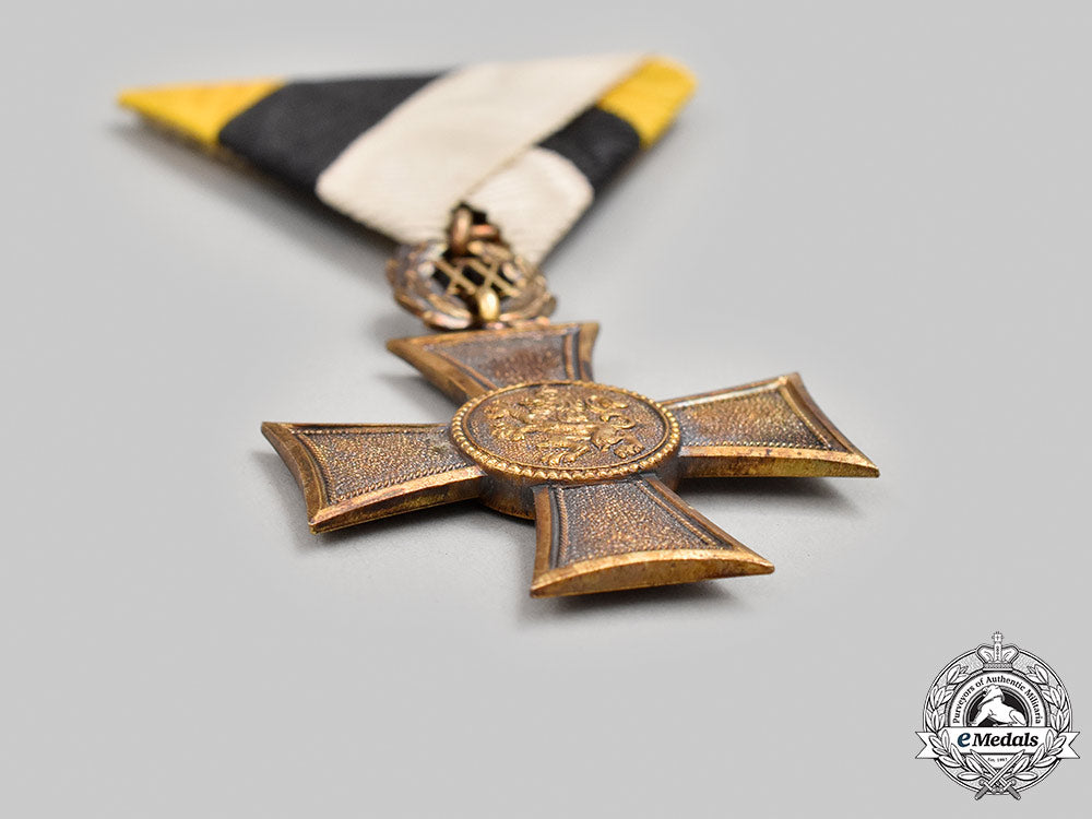 2. Long Service Cross, Bronze Cross for Twenty Years' Service for NCOs (three-piece construction, in bronze, measuring 39 mm (w) x 52 mm (h) inclusive of its wreath suspension, original triangular ribbon with hook and eye).
