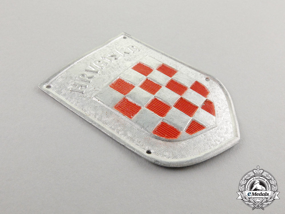 Croatia; Die-stamped aluminum with red lacquered red fields, slightly vaulted, four holes for uniform attachment, 42.7 mm (w) x 56.8 mm (h), extremely fine.