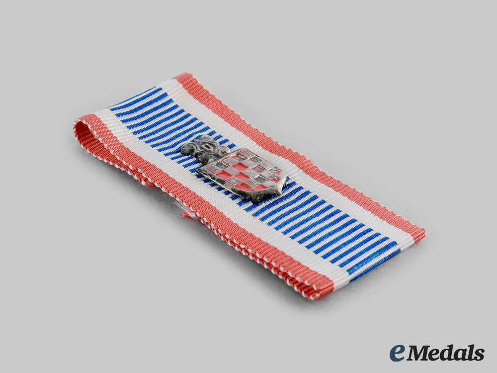 Badge in die-stamped silvered metal with red paint, bearing the Croatian coat-of-arms, measuring 12.2 mm x 21 mm, held in place via four intact prongs to a War Commemorative ribbon, scattered chipping in the red paint and silvering wear evident, very fine.