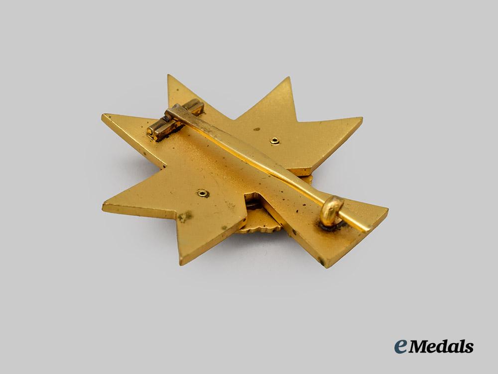 (Red krune kralja Zvonimira). Instituted 15 May 1941. (1941-1945 issue). Constructed of gilded bronze with multi-coloured enamels, consisting of a Croatian Cross, the obverse with white enameled arms, all overlaid through the central by gilded trefoils, overlaid by a central white enameled medallion bearing a raised and gilded Crown of King Zvonimir, situated within a semi-oval oak leaf wreath executed in green enamels with gilt highlights, the reverse with two blasted rivets securing the wreath in position, with an elongated barrel hinge and tapering vertical pinback meeting a rounded catch, unmarked but demonstrating the characteristics of an early (c. 1942) special variant manufactured by Gebrüder Godet, Berlin, measuring 51.92 mm (w) x 52.01 mm (h), weighing 30.4 grams, demonstrating minor flecking to the enamels, a rare German-made example in extremely fine condition.