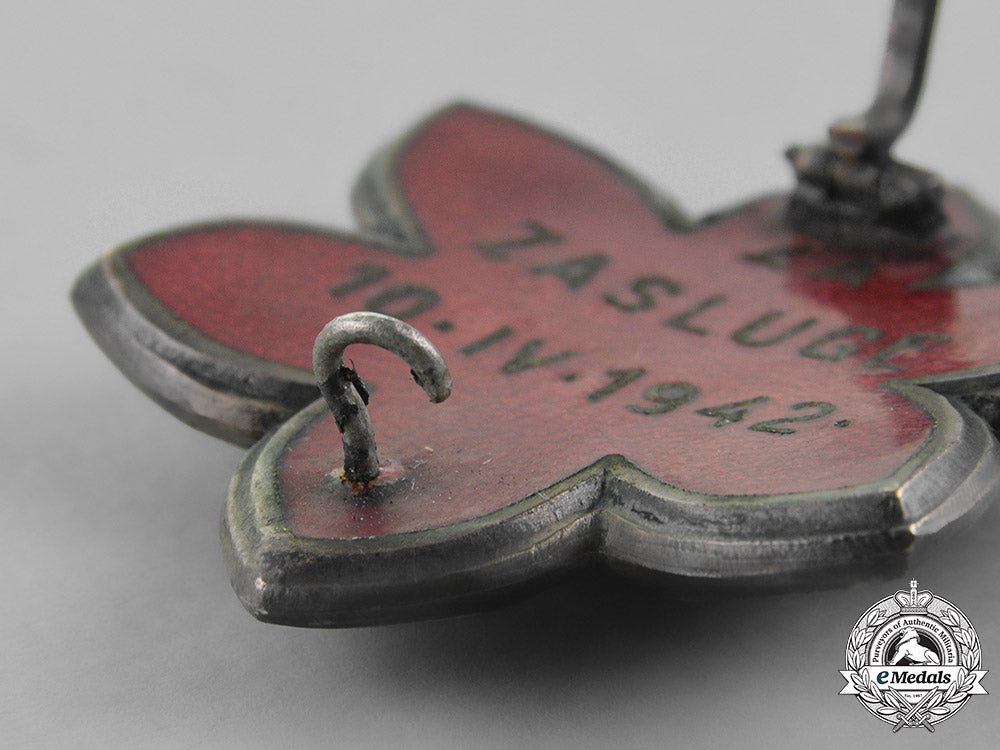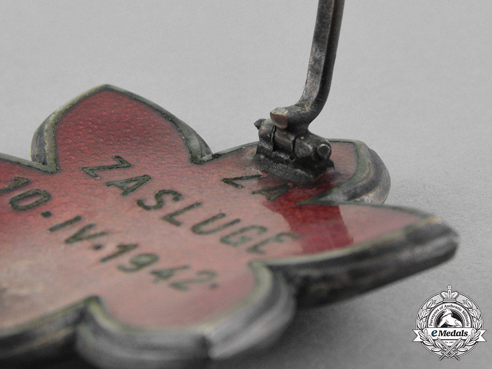 (Red za zasluge). Instituted in 1942. Type for Muslim. An ornately designed badge in the traditional Croatian wattle pattern, also known as the pleter or troplet, in silver, consisting of six red enamelled arms, obverse centre presenting a silver letter U with a flaming grenade with the Croatian šahovnica, together on a red enamelled background, reverse presenting Za Zasluge (For Merit) with institution date of 10 April 1942, with pin assembly, measuring 41 mm (w) x 46.5 mm (h), worn, and near extremely fine.