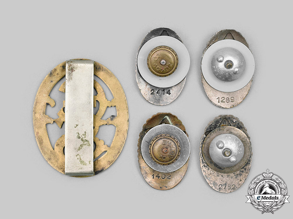 1. four Military School Badges: DU = Artillery School (Delostrelecke Uciliste), numbered "2414"; VU = Military School of Hero of Soviet Union Captain O Jaros (1958-) (Vojenske Uciliste Hrdiny SSSR Kapitana O Jarose), numbered "1289"; LTU = Air Force Technical School (Letecke Technicke Uciliste), numbered "1402"; LU = Air Force School (Letecke Uciliste), numbered "2752" (each badge with a two-piece construction, in silvered bronze with red enamels, number impressed on the reverse, the first two measuring 24.5 mm (w) x 36.3 mm (h), the latter two measuring 24.2 mm (w) x 36 mm (h), all four with a screwback maker marked "ZUKOV" and support plate);