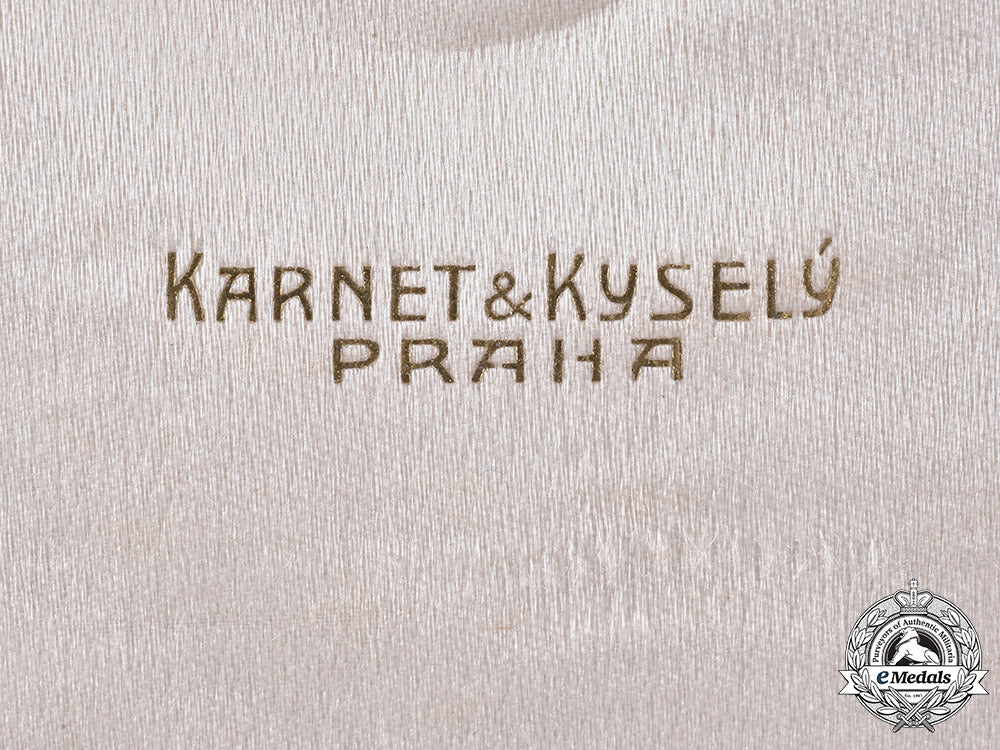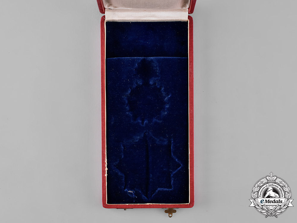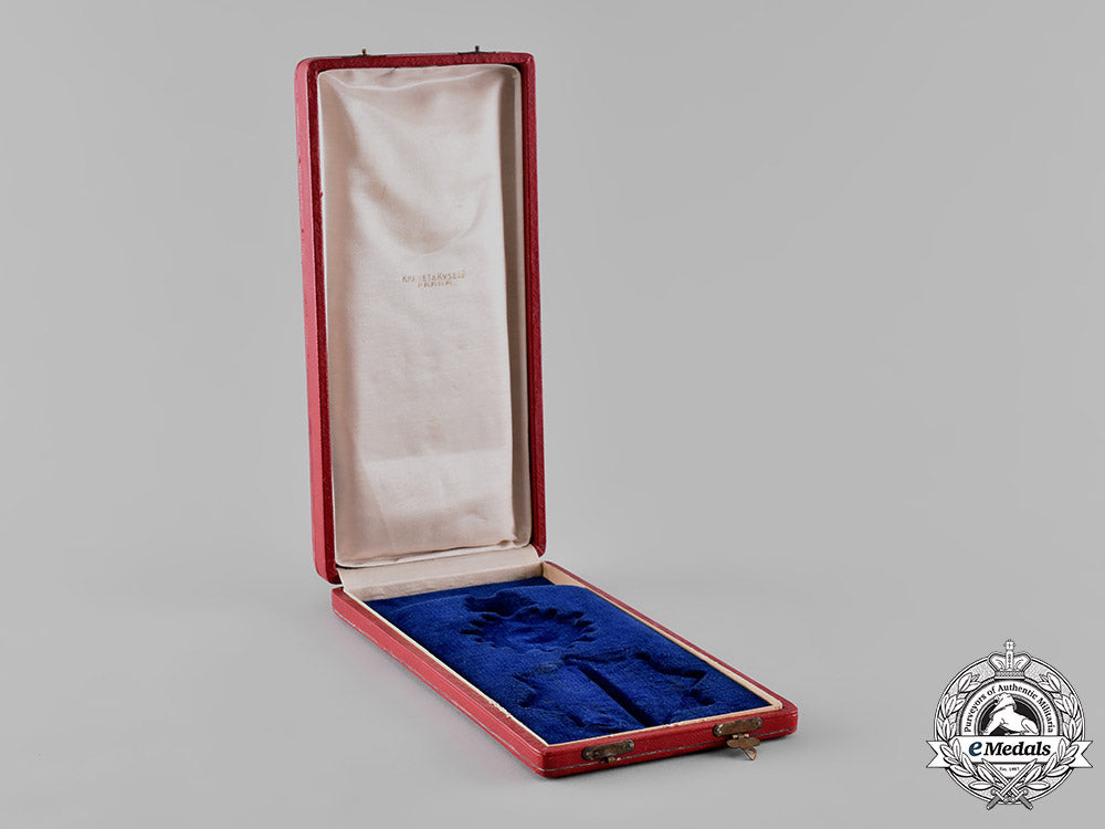 Rád Bilého Lva. Instituted in 1922. Hardshelled, deep red thatched-look cloth exterior, lacquered on five sides, the bottom without lacquer and maker marked "LINDAUER PRAHA" with the company's insignia, Czech lion in silver-coloured ink on the lid, Order maker marked "KARNET & KYSELÝ PRAHA" on the white satin inside lid, a white cardboard insert placed within the base and housing a navy blue velvet raised platform with recessed medal beds for the badge and breast star, dual-hinged, two clasp closure, one of which is missing, measuring 117 mm (w) x 252 mm (h) x 37 mm (d), light wear and scuffing evident on the exterior, small nip in the navy blue velvet where the breast star was housed in the medal bed, very fine.