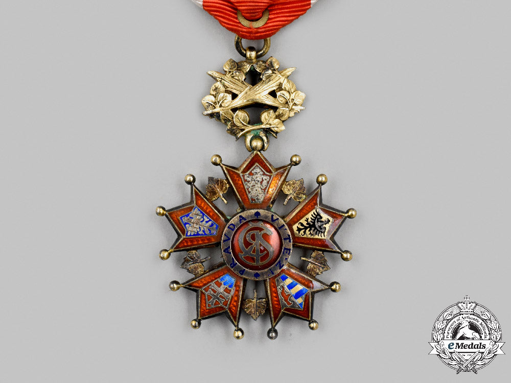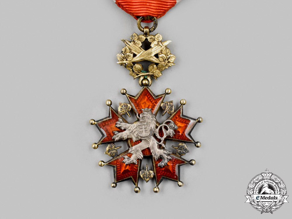 (Řád Bílého lva). Instituted in 1922. Multi-piece construction, in silver gilt with red, blue and black enamels, hallmarked with the Slovak arms and fronted by a "3" (900 silver, the hallmark used between 1929 and 1942), marked "900" (silver) and maker marked "KK" (Karnet & Kyselý of Prague) on the ring, measuring 43.8 mm (w) x 64 mm (h) inclusive of its crossed palms and wreath suspension, intact enamels, light contact, large rosette on its original ribbon, near extremely fine.