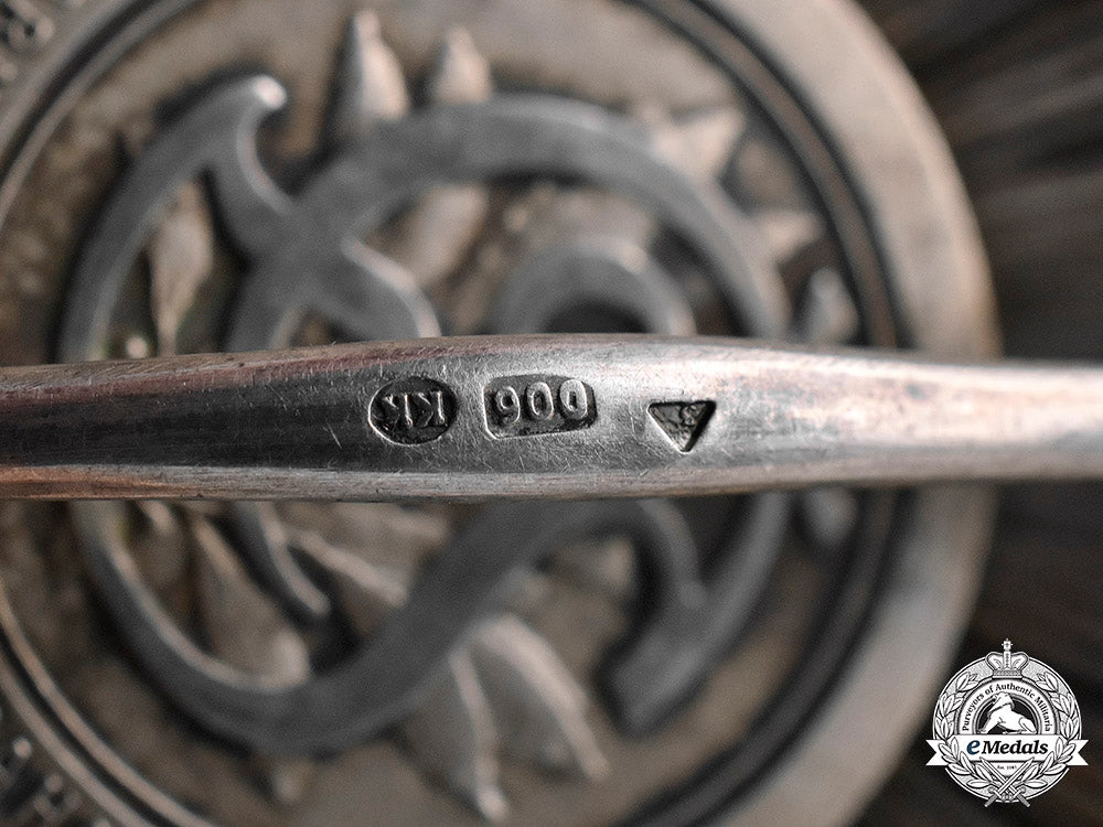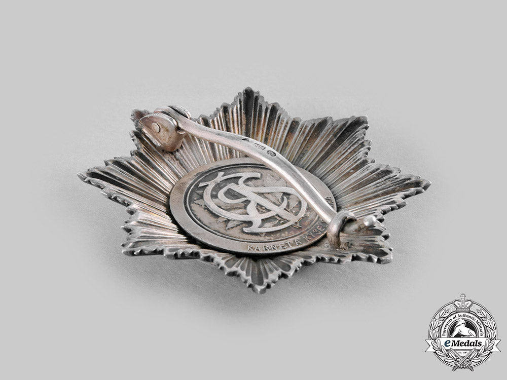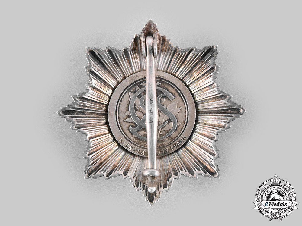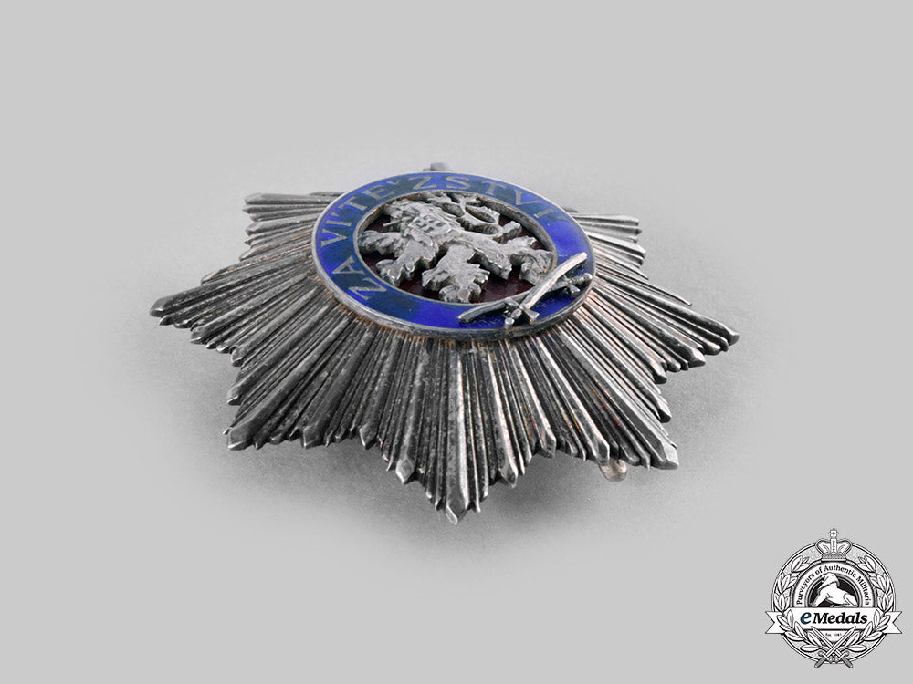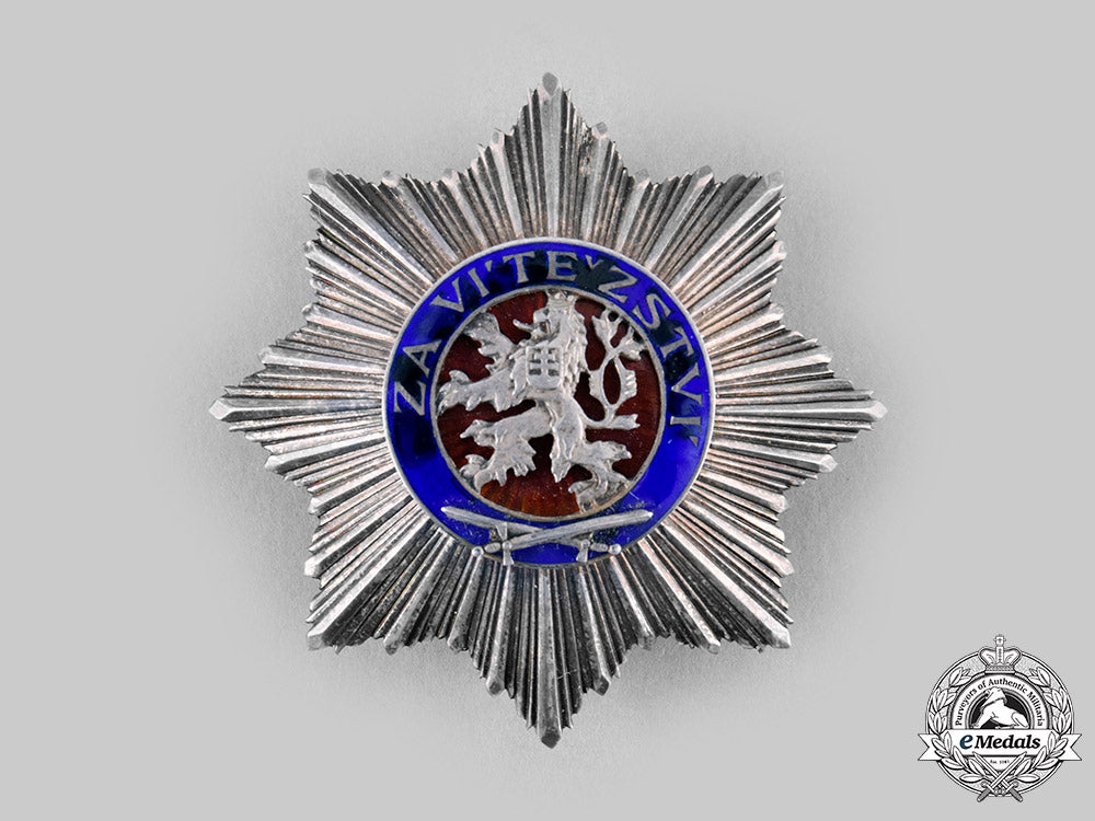 (Ceskoslovenský vojenský rád Bilého lva "Za vítezství"). Instituted on February 9, 1945. World War II Issued. An exceptional multi-rayed eight-pointed star in silver, obverse medallion featuring a superimposed central silver heraldic lion, on an enameled red background, surrounded by an enameled blue border inscribed "Za vítezství" (For Victory), along with two crossed swords also in silver, reverse with principal pin assembly, marked by Czechoslovakian hallmark denoting .900 silver purity, along with maker’s mark "KK" (for KARNET & KYSELY, Praga), measuring 53.98 mm (w) x 54.43 mm (h), toned silver, minor discoloration in blue enamel, extremely fine.