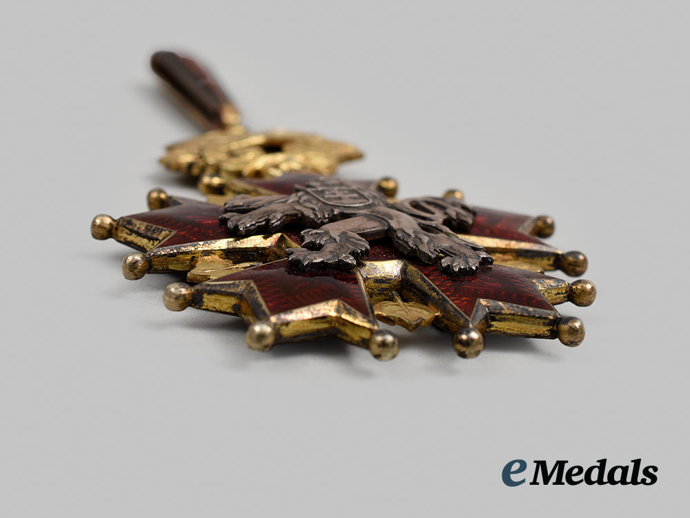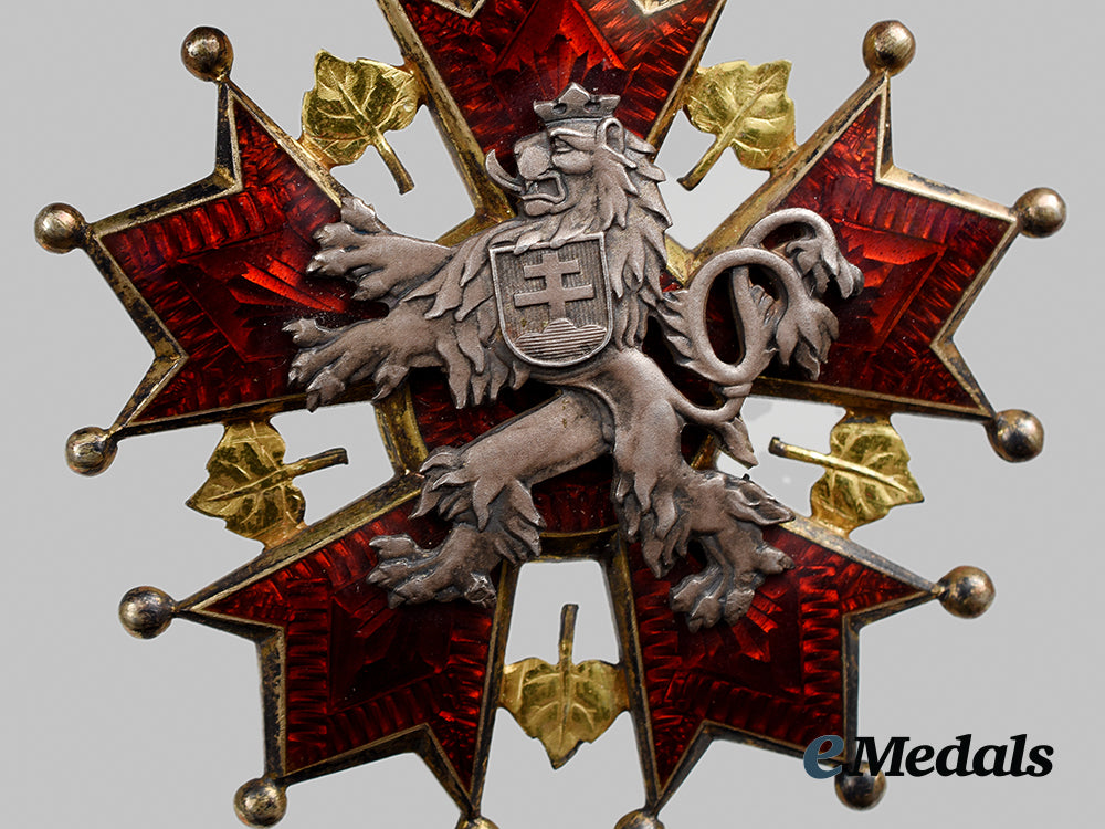 (Řád Bílého lva). Instituted December 7, 1922. In silver, a large repeating point red enamel cross with ball finials, silver gilt leaflets in each quadrant, the obverse medallion presents a superimposed silver rampant lion, reverse centre with motto PRAVDA VÍTĚZÍ (Truth Prevails), coat of arms of the former parts of Czechoslovakia on each arm (Bohemia, Moravia, Silesia, Slovakia and Carpathian Ruthenia), with hollow leaflet suspension with crossed palms, elongated triangular suspension for ribbon attachment with red enamel on the obverse, measures 59.6mm (w) x 84.2mm (h – inclusive of integral ball on leaflet suspension), weighs 68.9 grams (excluding ribbon), accompanied by original neck ribbon (missing ties at each end), dark patina on silver arms, enamels intact, in extremely fine condition.