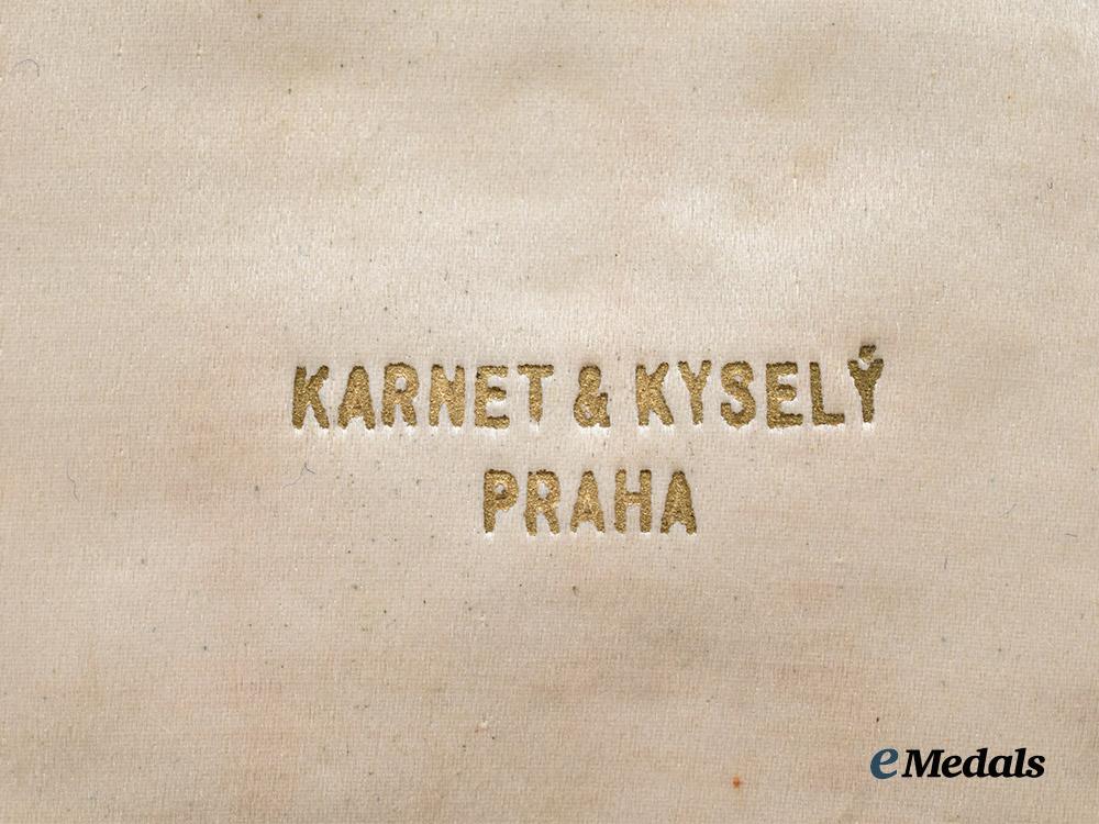 Contained in original case of issue, red pebbled exterior with Czech lion on the lid, interior lid marked KARNET & KYSELY PRAHA, with a dark blue velvet medal bed, measures 75 mm (w) x 140 mm (h) x 25 mm (d), hinge and clasp functional, light wear, very fine.