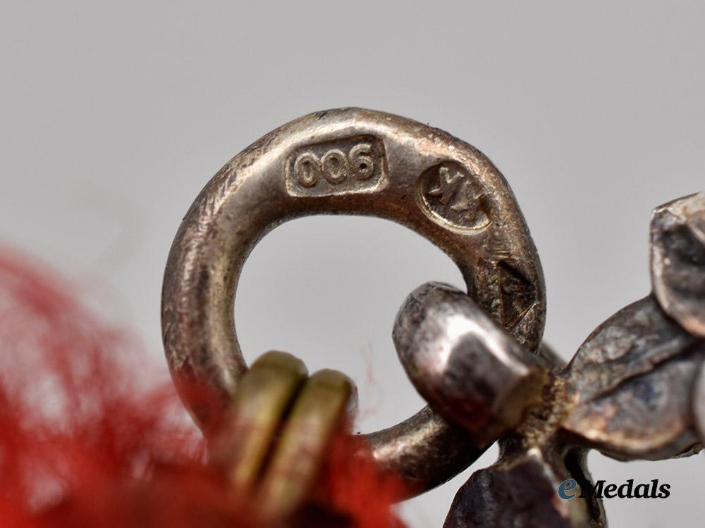 (Řád Bílého lva). Instituted in 1922. Multi-piece construction, in silver presenting a five armed decoration in red enamels with ball finials and a silver leaf between each quadrant, the obverse presents a rampant left facing crowned lion, the reverse presents a different Czechoslovakian symbol on each arm in multicoloured enamels and the inscription CSR in the center with a silver surrounding ring inscribed PRAVDA VITEZI, surmounted by a wreath with crossed palms denoting civil division, measures 44.10mm (w) x 63.75mm (h – inclusive of wreath suspension and integral ring), weighs 24.8 grams (including ribbon), maker marked KK (Karnet & Kysely) and 900 on ring, worn on original ribbon, enamels intact, scattered silver wear, overall extremely fine condition.