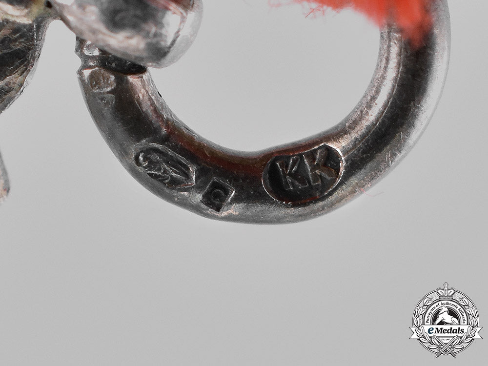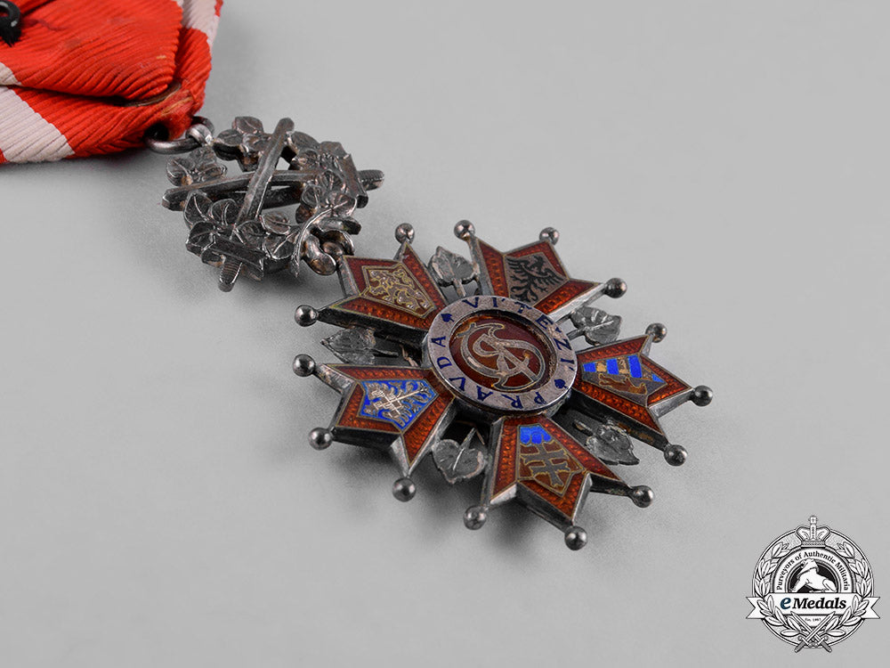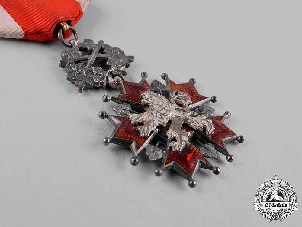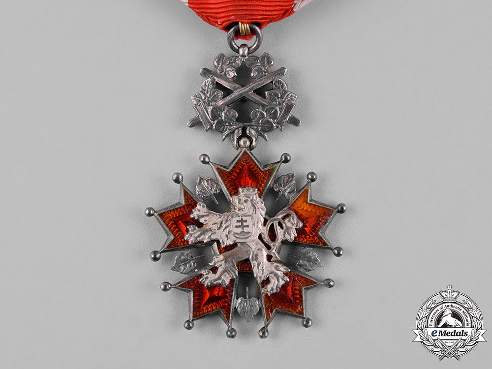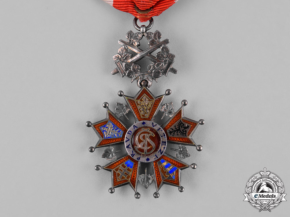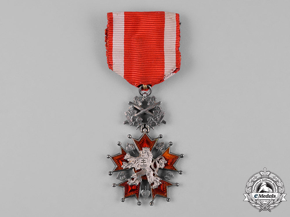 (Řád Bílého lva). Instituted in 1922. Military Division. In silver with red, silver, blue and black enamels, hallmarked with a goat's head above the number "3", marked with a "c" and maker marked "KK" (Karnet & Kysely of Prague) on the ring, measuring 44 mm (w) x 63.2 mm (h) inclusive of its wreath of linden leaves and crossed swords suspension, repair evident in the red enamels on two arms on the obverse, scattered frosting wear, on its original ribbon with hook and eye, fine.