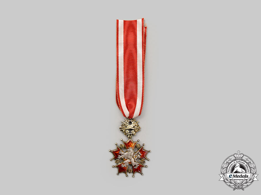 (Rád Bilého Lva). Instituted in 1922. In silver gilt with red, blue and black enamels, hallmarked with a goat's head beside the number "2" (.925 silver) and maker marked "KK" (Karnet & Kyselý of Prague) on the ring, measuring 44.3 mm x 64 mm inclusive of laterally-pierced ball and its wreath of linden leaves and crossed palms suspension, exhibiting chipping in the red enamels on three arms on both the obverse and reverse, replacement ribbon, fine.