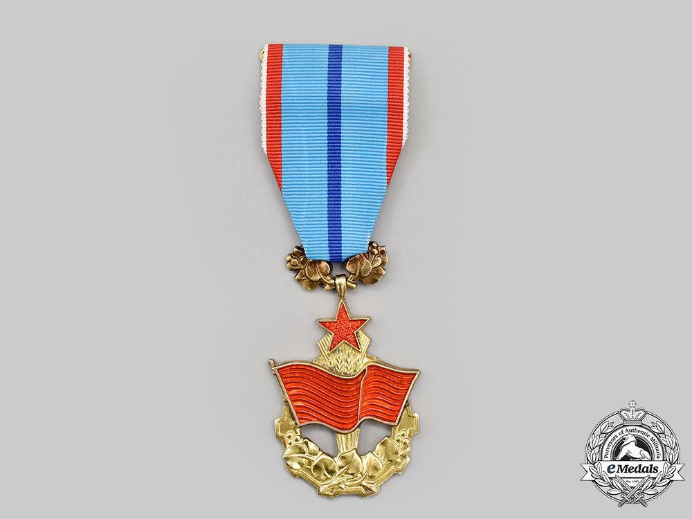 (Řád rudého praporu práce). Instituted in 1955. Type II (1960-1989). In silver gilt with red enamels, number impressed "15495", silver fineness marked with a goat's head above the number "2" (silver fineness .925), maker marked "MK" (Mincovna Kremnica = Kremnica Mint) and marked "925" (silver) on the reverse of the wreath suspension, measuring 40.3 mm (w) x 68.3 mm (h) inclusive of its linden leaves wreath suspension, intact enamels, scattered gilt wear evident on the reverse, original ribbon with pinback, near extremely fine.