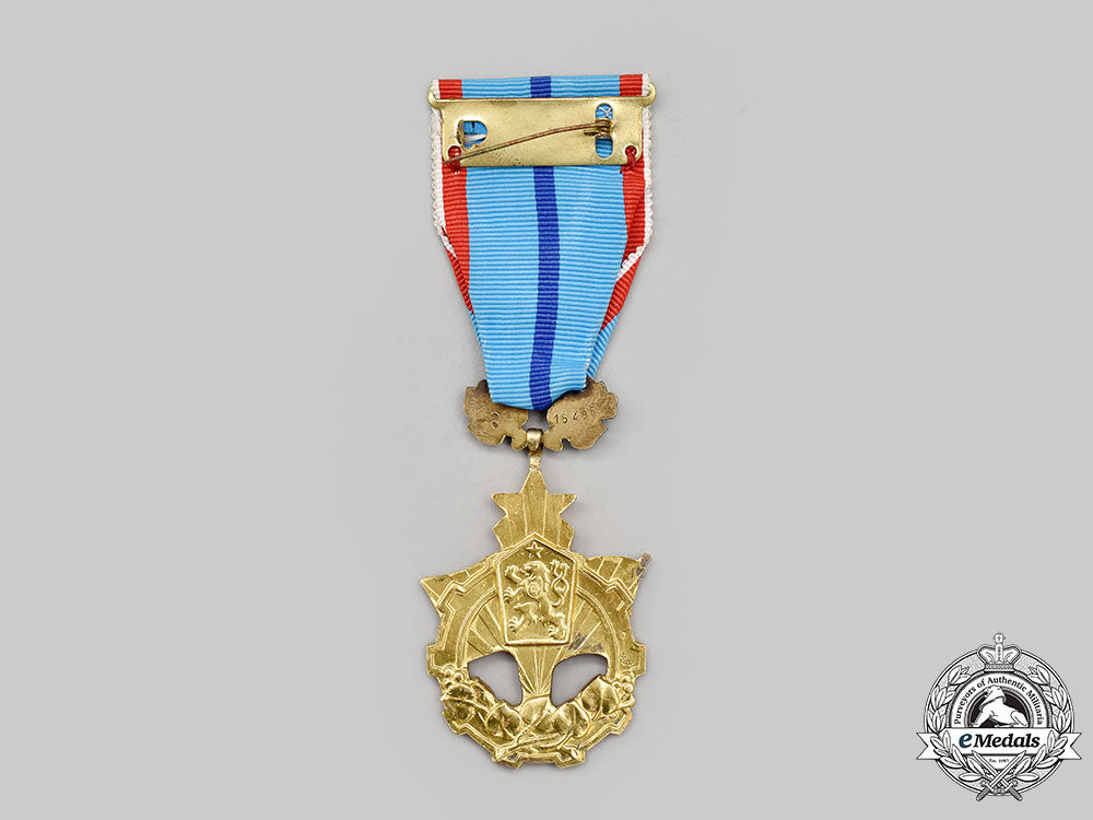 Footnote: The Order of the Red Banner of Labour was instituted on May 4, 1955 and awarded for exceptional merit in economic, scientific and cultural development. It was awarded upon retirement to individuals who had rendered outstanding service within agriculture, manufacturing, and other production fields. There are two main versions of the Order: Type I awarded from 1955-1960 features a rearing lion wearing a crown on the reverse; Type II awarded from 1960-1989 features the rearing lion surmounted by a star from the 1960 Czechoslovak coat-of-arms on the reverse.