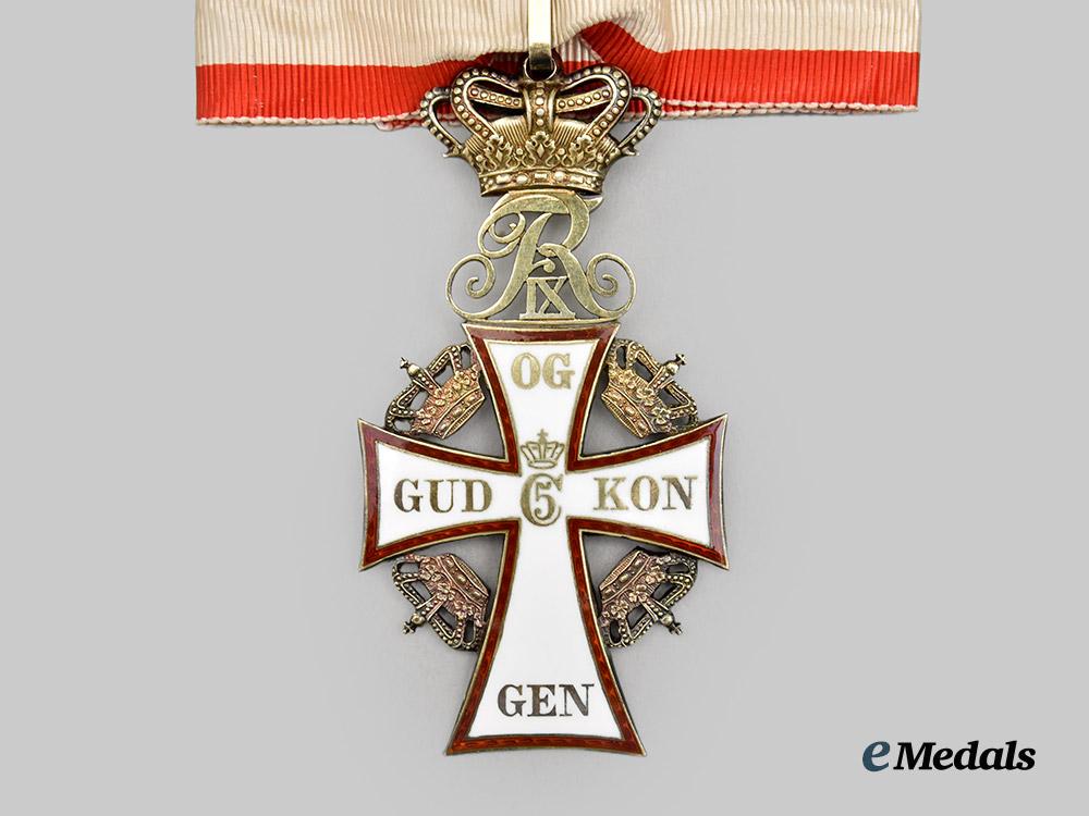 (Dannebrogordenen). Instituted in 1671. Frederick IX (1947-1972). In silver gilt, an oblong Latin Cross exhibiting finely enameled white arms with red borders, with royal crowns in each quadrant, the obverse center presents the royal cipher of Christian V, with the inscription GUD OG KONGEN (GOD AND THE KIND) on its arms, the reverse center displays the crowned W, with the crowned F VI on the twelve o’clock arm, the dates 1219, 1671, and 1808 appear on the other arms, surmounted by the royal cipher of Frederick IX crowned with the distinctive Danish royal crown, unmarked, on correct partial ribbon, measures 76.6 mm (h) x 41 mm (w), extremely fine.