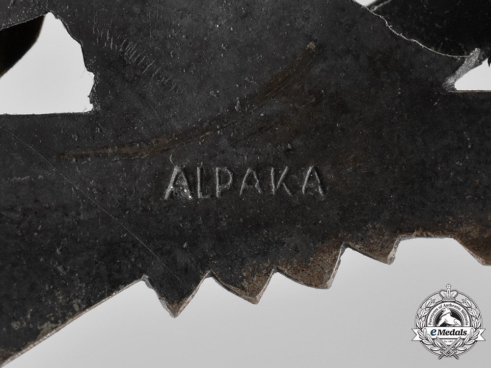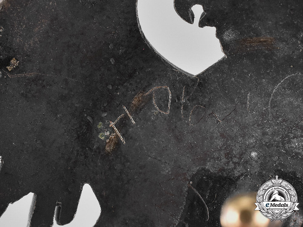 Eagle base in nickle silver (AKA alpaca), with the Estonian coat-of-arms in bronze gilt and blue enamels, along with a cannon in bronze gilt affixed to the eagle base, hand engraved with the owner's name, museum marked in red ink "60" and marked "ALPAKA" (nickle silver) on the reverse, measuring 42.3 mm (w) x 40.7 mm (h), maker marked "ROMAN TAVAST TALLINN" on the silvered bronze screwback, gilt wear evident on both the coat-of-arms and cannon, near extremely fine.