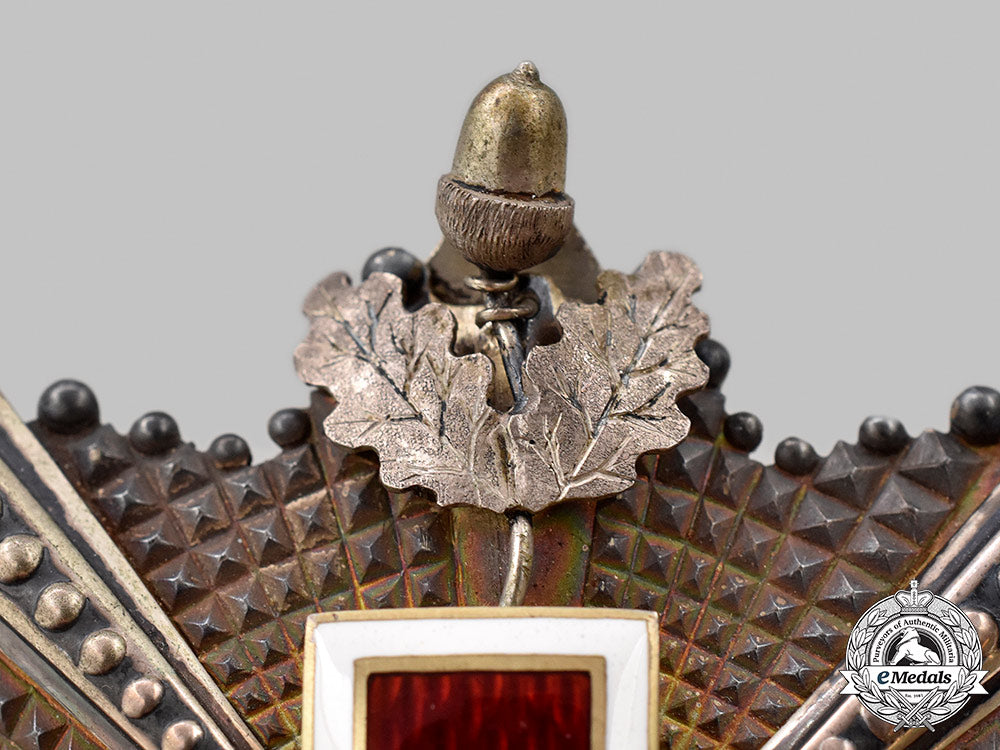 (Eesti Punase Risti teenetemärk). Instituted in 1920 by the Estonian Red Cross Society. A rare die stamped star in silver, consisting of eight beaded arms with clusters of individual faceted rays in each quadrant, 12 o'clock arm having been privately altered to include a handmade set of oak leaves and acorn, obverse centre presenting a red enamelled cross with white enamel and gilt borders, central medallion with three Estonian lions in blue enamel on a gold enamel background, with a national colour surround and silver gilt oak leaves, reverse with privately constructed backplate affixed to cross via central screwpost, dual horizontal stays and a principle pin assembly, measuring 83 mm (w) x 81 mm (h), weighs 85.8 grams, minor enamel contact, oak leaf slightly loose, lovely patina, in near extremely fine condition.