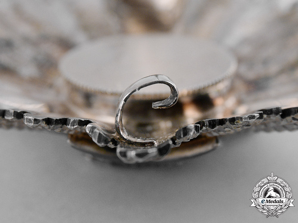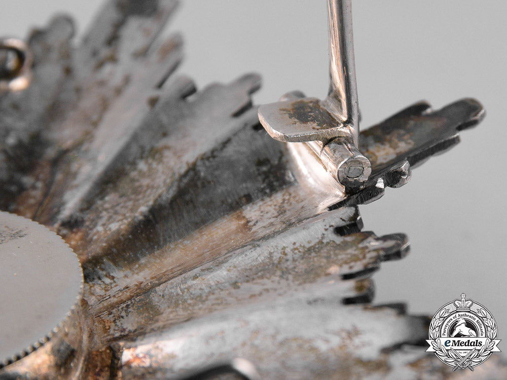 (Kotkaristi teenetemaerk). Instituted on 24 February 1928. 1928-1950 issue. A beaded multiple-rayed eight-pointed star in polished silver, the obverse centre presents an enameled black Maltese cross in silver gilt, displaying a highly detailed silver Estonian eagle holding a sword and the Estonian coat of arms, with three blue lions on a silver shield, the reverse presents a principle pin assembly dual stays, measuring 86.17 mm (w) x 85.76 mm (h), presenting damage on the tip of the seven o’clock arm, minot tarnished silver, otherwise extremely fine condition.