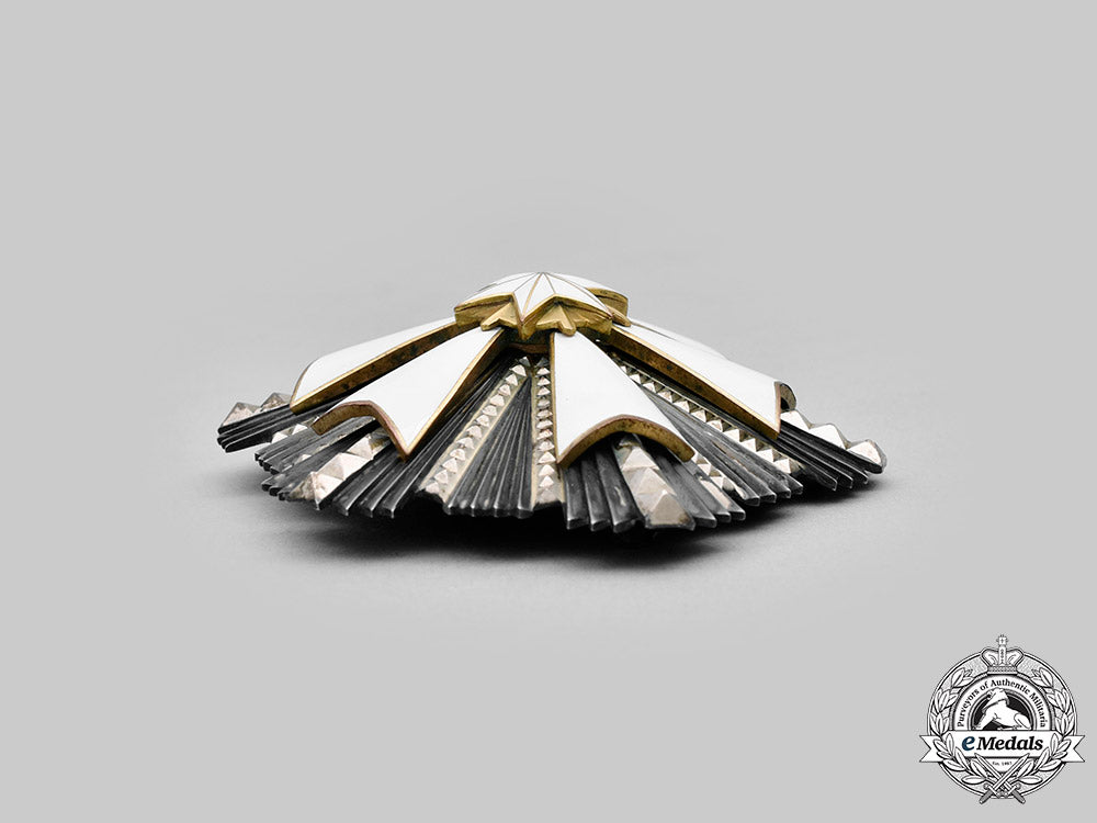 (Valgetähe teenetemärk). Instituted in 1936. A six-sided star insignia in silver gilt with white enamels centred on a six-armed white enamelled cross, all of which is mounted to a six-sided silver star base, consisting of three or four smooth rays alternating with one thick faceted ray, weighing 109.2 grams, measuring 76.2 mm (w) x 83 mm (h), vertical pinback flanked by dual stays, intact enamels, chipping and crazing evident in the white enamels on one star point on the star insignia, cross loose versus the star base, better than very fine.