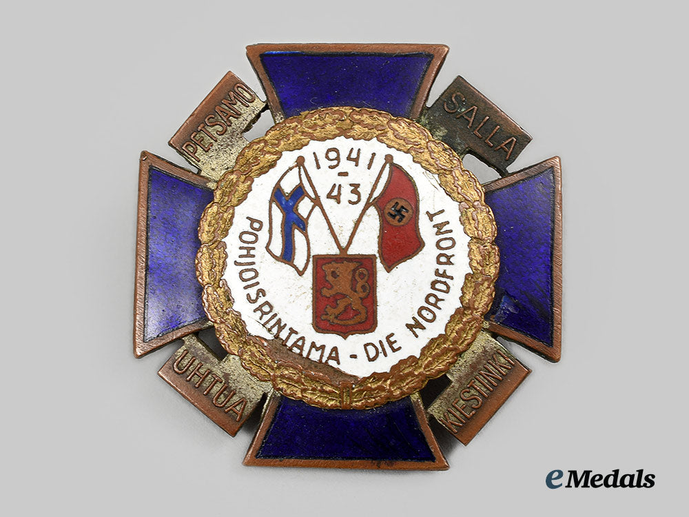 (Nordfrontkreuz). Constructed of bronze with multi-coloured enamels, consisting of a Cross Pattée, joined together through the quadrants by a mobile swastika with its arms bearing the raised names of key engagements, the obverse of the cross with dark blue enameled arms, bearing a central circular oak leaf wreath surrounding a white enameled disc, bearing a central Finnish coat of arms topped by the flags of both Finland and Germany, the latter flanking dates “1941-43” and circumscribed by an inscription of “POHJOISRINTAMA - DIE NORDFRONT”, the reverse with a central threaded lug retaining an original washer, unmarked, measuring 34.70 mm (w) x 34.72 mm (h), weighing 17.3 grams, some flecking and chipping is visible to the enamels and the base metal demonstrates total loss of silver finish, in very fine condition.