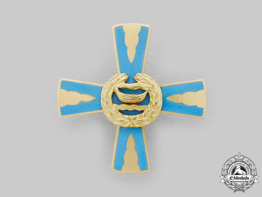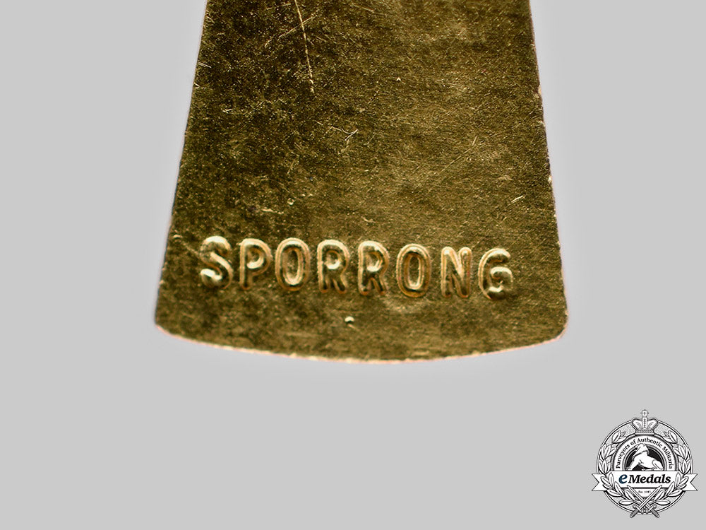 (Siikajokikorset). Two-piece construction, in bronze gilt with azure blue enamels, maker marked "SPORRONG" on the reverse of the arm at 6 o'clock, measuring 40.2 mm (w) x 40.4 mm (h), screwback, very light contact, near extremely fine.