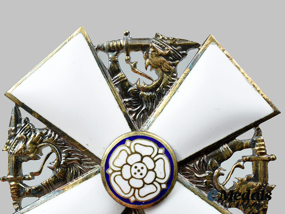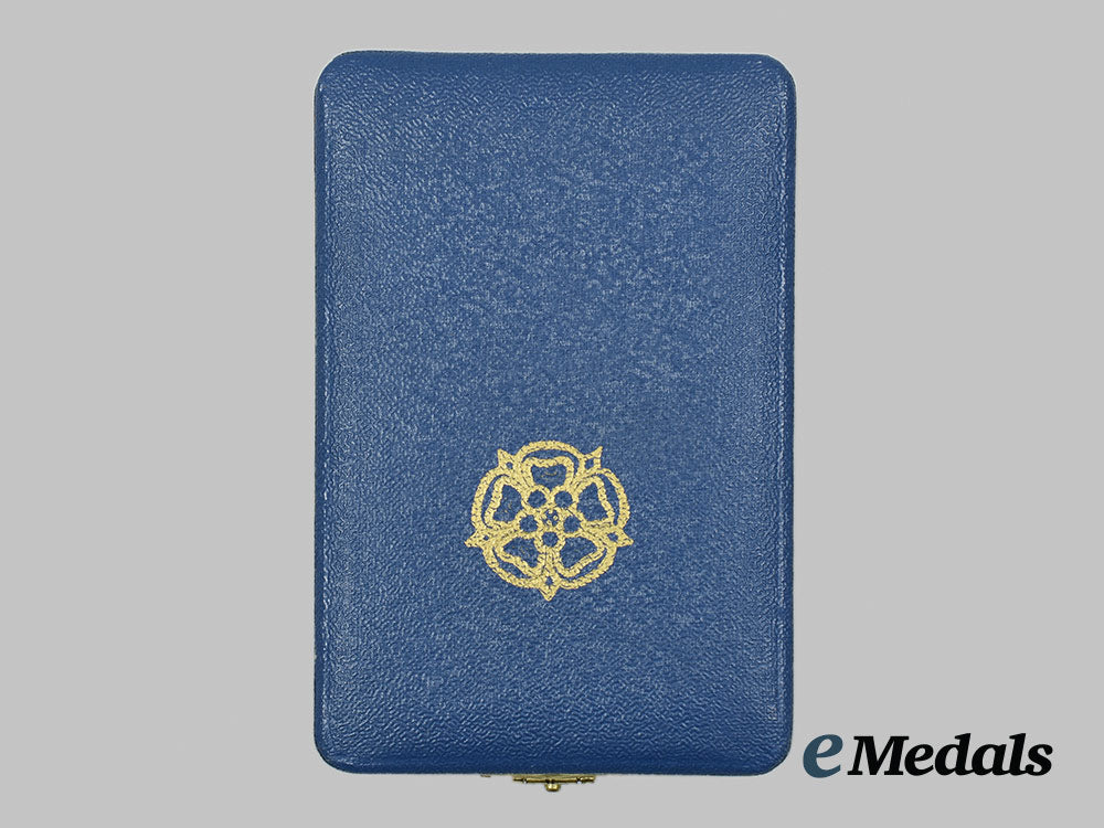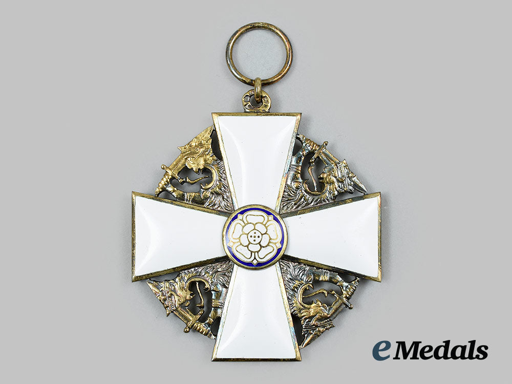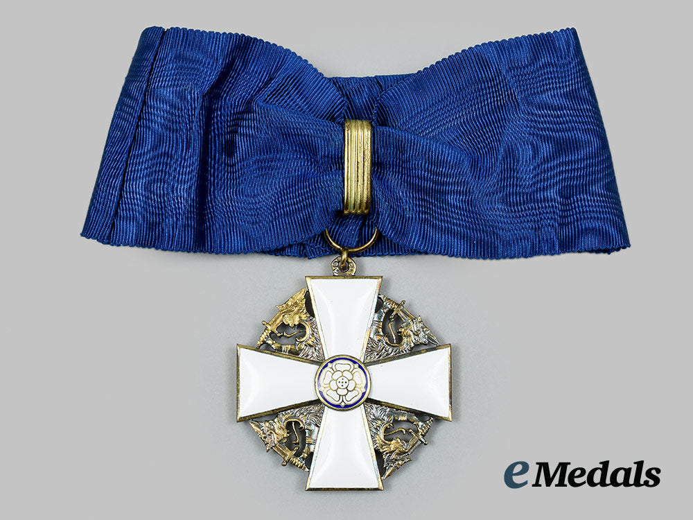 (Suomen Valkoisen Ruusun ritarikunta). Instituted in 1919. In silver gilt with white and blue enamels, marked with the crown national mark, maker marked "AT" within a diamond-shaped border (Alexander Tillander, Helsinki), marked "830" (silver), Helsinki city marked, with the date mark indescipherable, measuring 50.5 mm (w) x 55.2 mm (h) inclusive of its integral ring, intact enamels, contact marks evident on the integral ring that obscures the date mark, on its original full-length neck ribbon, near extremely fine. Accompanied by two Rosettes, measuring 8.8. mm in diameter each, one with a pinback, the other with a button hole attachment, in its hardshelled case of issue, wavy patterned exterior, Order of the White Rose insignia in gold-coloured ink on the lid, maker marked "A. TILLANDER" on the white satin inside lid, the base with a raised platform with a recessed medal bed in a blackish-blue felt, measuring 78.5 mm (w) x 121.8 mm (h) x 36 mm (d), light age soiling evident in the base, case also near extremely fine.