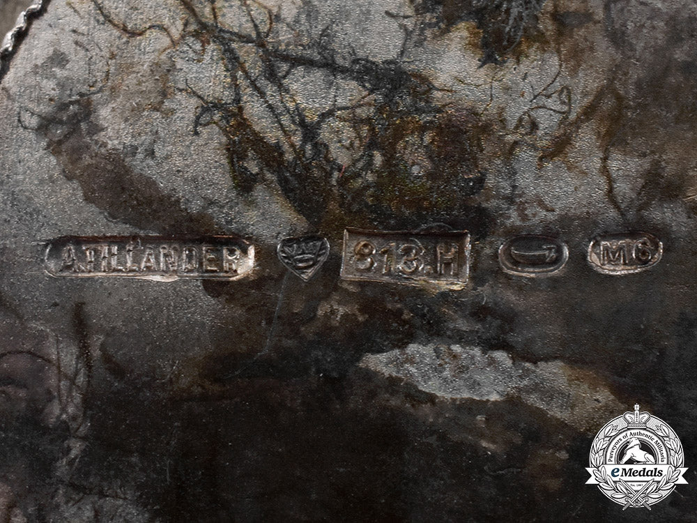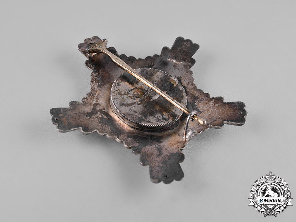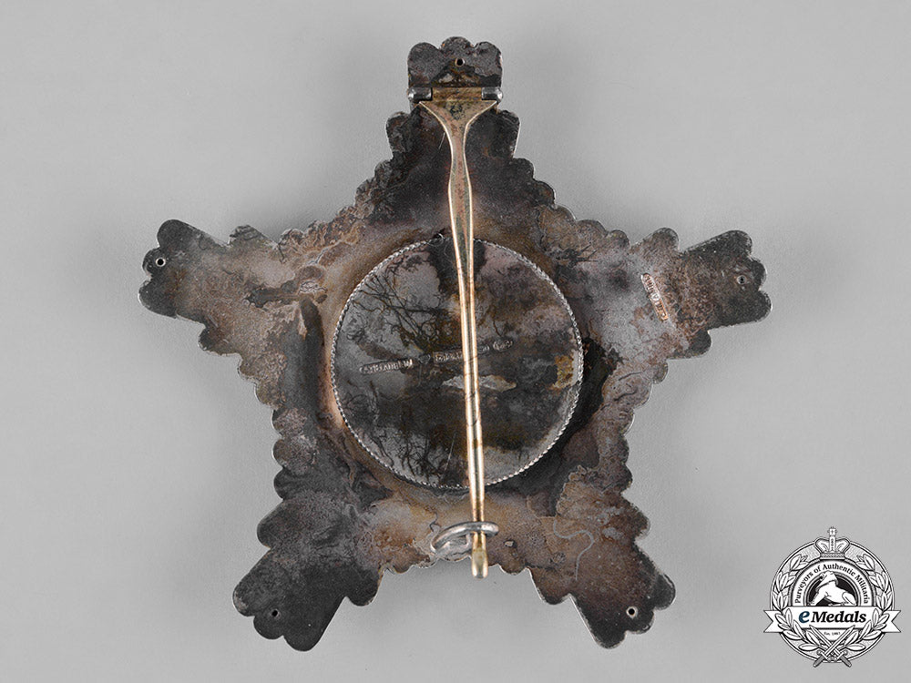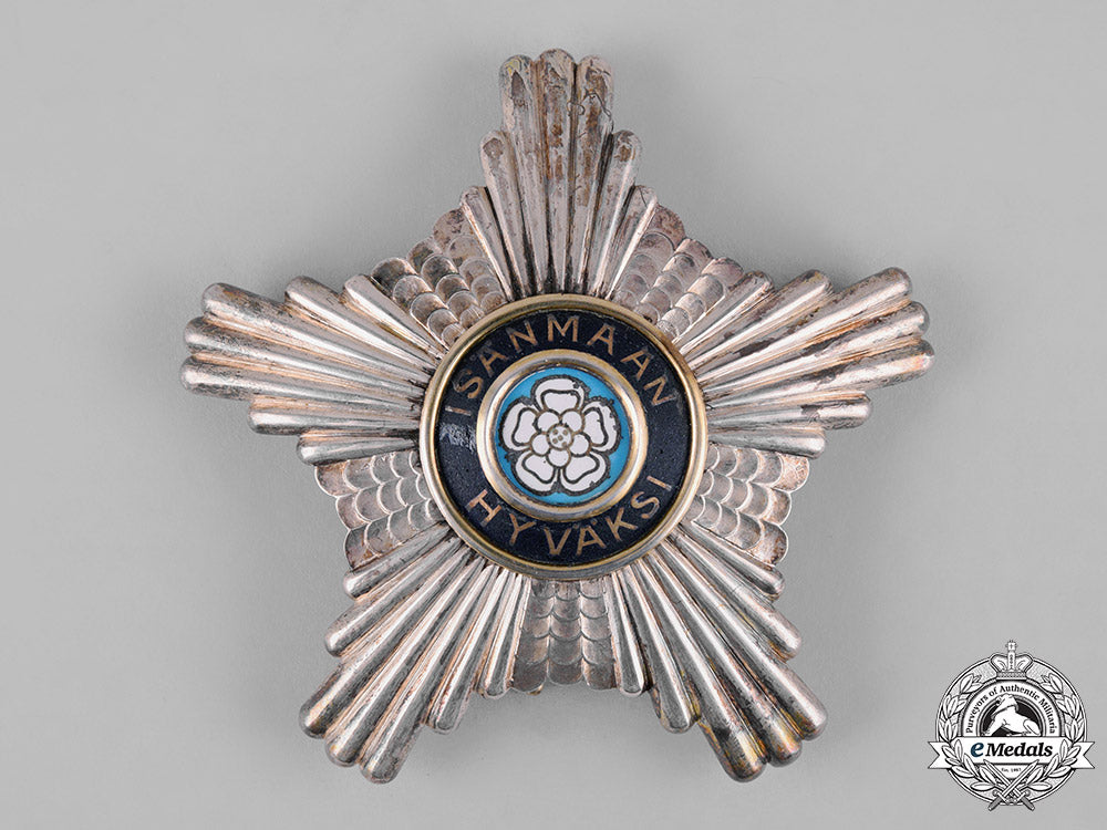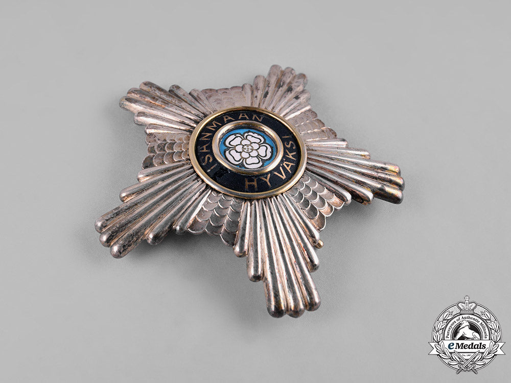 Suomen Valkoisen Ruusun ritarikunta. Instituted in 1919. Type II (1936-). Insignia in silver gilt with light blue, white and black enamels, mounted to a silver five-pointed star base, maker marked "A. TILLANDER" (Alexander Tillander & Co. of Helsinki), marked with the National crown, marked "813.H" (813 Hopea = Silver), Helsinki city marked and date marked "M6" (1941) on the reverse, measuring 79 mm (w) x 77.5 mm (h), vertical pinback, intact enamels, extremely fine.