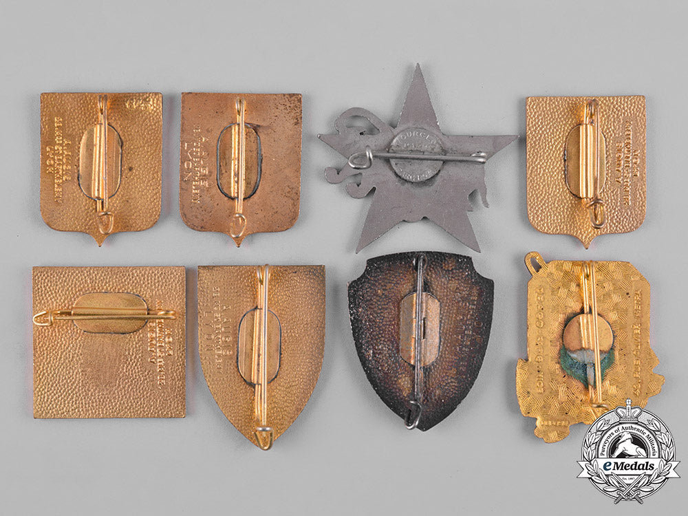 Seventeen French Military insignia badges, all constructed from bronze, six silvered, eleven in gilt, sixteen with various colours of enamels, thirteen maker marked with A. AUGIS (28 Me ST BARTHELEMY, LYON), two maker marked with DRAGO PARIS NICE, one maker marked with MOURGEON, one unmarked, in various sizes, seven with a vertical pinback, seven with a horizontal pinback, three with dual lugs, intact enamels and pinbacks, ranging in conditions from very to extremely fine.