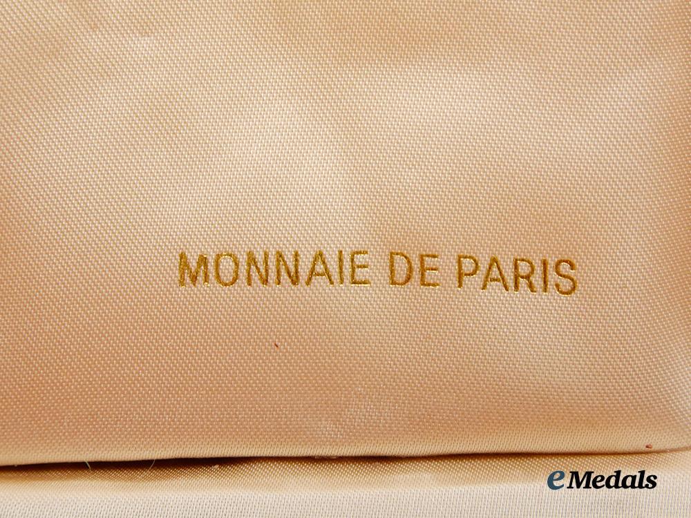 Accompanied by its case of issue, a red leatherette exterior, red velvet interior with lid marked MONNAIE DE PARIS, measures 10 cm (w) x 16.5 cm (l) x 4 cm (d), hinge and clasp functional, light wear, in very fine condition.