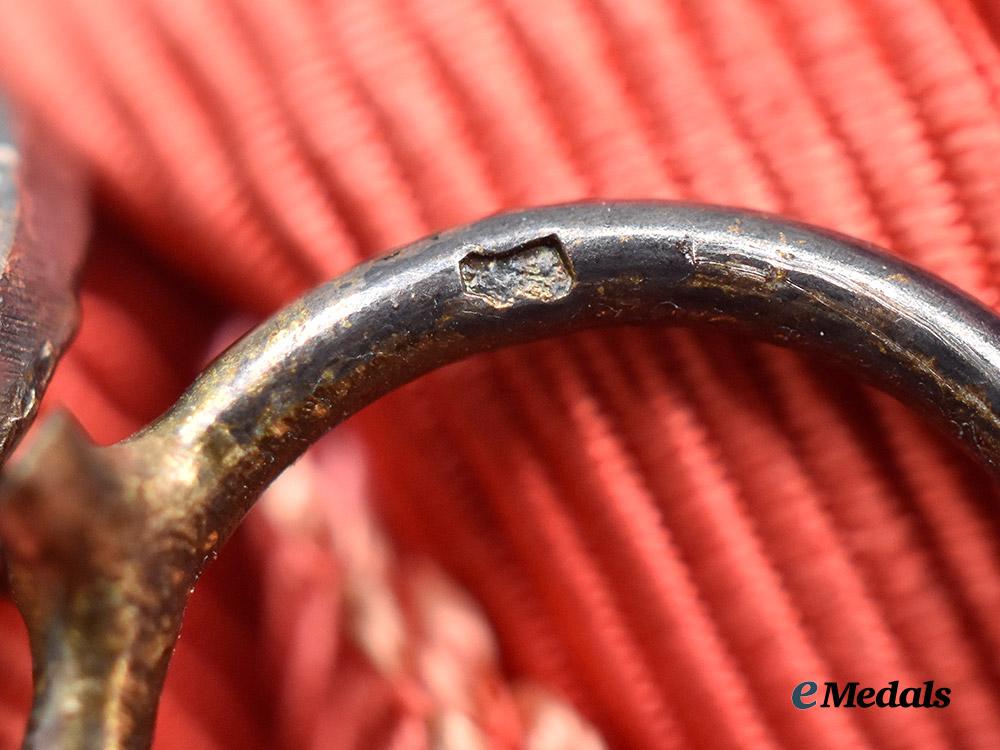 (Ordre de la Légion d'Honneur, Chevalier). Instituted in 1802. Badge of the order in silver gilt with a five pointed white enameled cross with ball finials, green enameled laurels in each quadrant and centre presenting Marianne with blue enamel surround, reverse centre with cross enameled flags, measuring 63.1 mm (w) x 91.5 mm (h - inclusive of laurel suspension with integral ring), silver hallmarked with boars head on laurel tassels, enamel loss to blue surround, both centres and laurels, original sash, fine. Accompanied by the star of the order, in silver with a five pointed star with ball finials, five smooth rays in each quadrant, measuring 94.5 mm (w) x 90 mm (h), marked with a boar's head and maker marked "AB & Co" (Arthus Bertrand & Compagnie) on the pin,vertical pinback flanked by dual stays, light contact and surface wear overall, extremely fine.