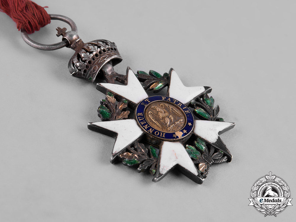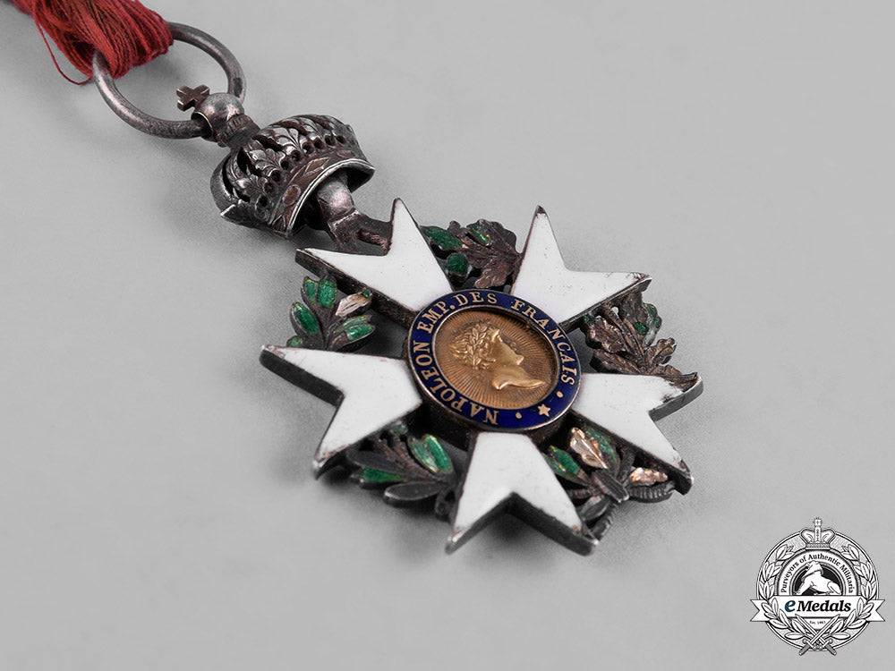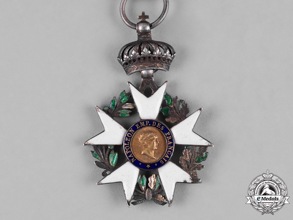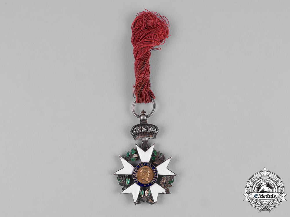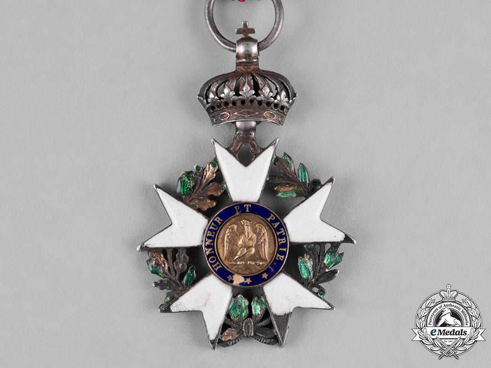 (Ordre national de la Légion d'honneur, Légionnaire). Instituted in 1802. Type II (1806). In silver with white, blue and green enamels, Gold centrepieces, hallmarked with a fasces on the ring, measuring 37 mm (w) x 54.8 mm (h) inclusive of its crown and laterally-pierced ball suspension, chipping and crazing evident in the white enamels on the arms and in the green enamels on the wreath on both sides, along with the blue enamels on the reverse centrepiece ring, original frayed ribbon, fair.