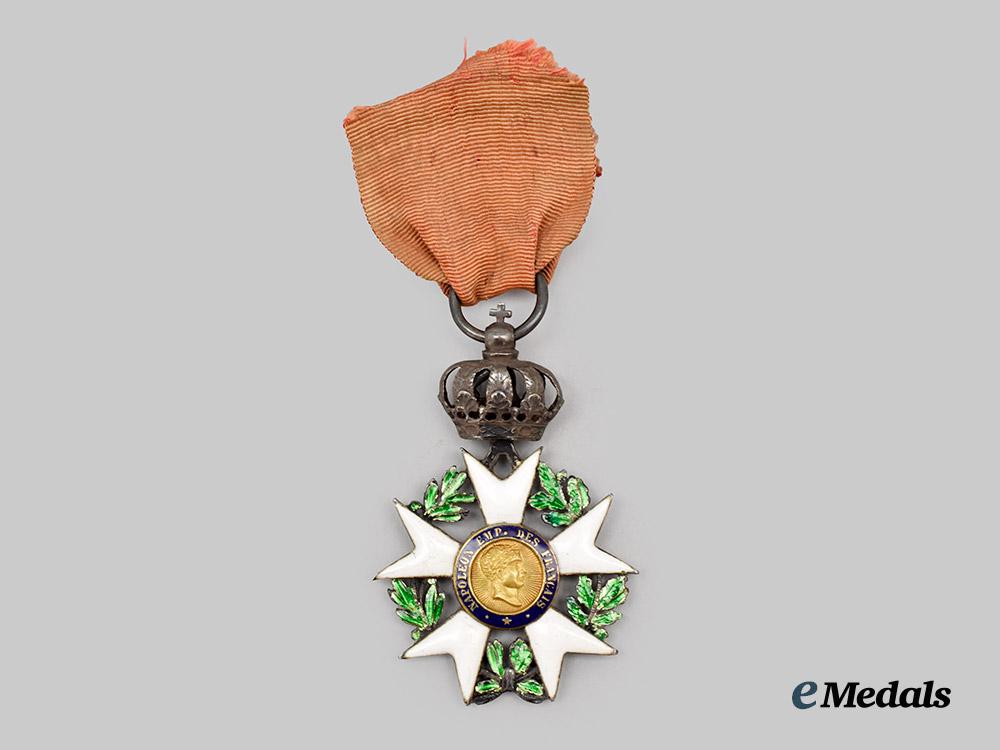 (Ordre national de la Légion d'honneur, Chevalier). Instituted in 1802. Type I. (1806-1813). An early Legion of Honour in silver, featuring a white Maltese cross with segments of green laurel and oak leaf, the obverse medallion in 18 K Gold featuring a right facing portrait of Napoleon encircled by a blue ring inscribed NAPOLEON EMP. DES. FRANCAIS, the reverse medallion features an eagle with outstretched wings, encircled by a blue ring inscribed HONNEUR ET PATRIE, surmounted by a silver crown, measures 37.3 mm (w) x 55.0 mm (h), weighs 17.80 grams including ribbon, worn on a small segment of original red ribbon (faded and soiled), light enamel wear to wreaths, otherwise a lovely decoration in near extremely fine condition.