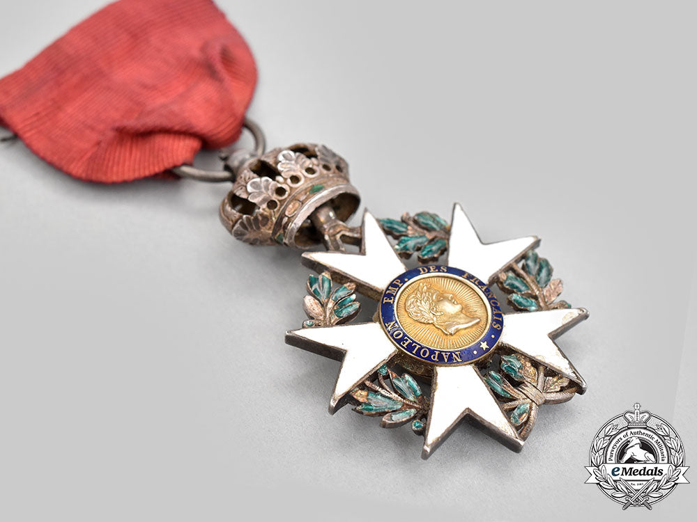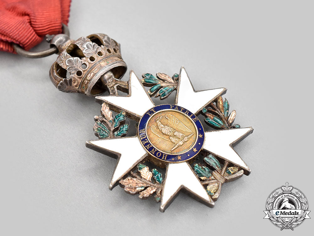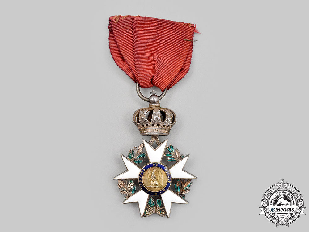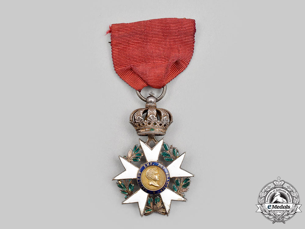 (Ordre national de la Légion d'honneur, Légionnaire). Instituted in 1802. Type I (1808-1813). In silver gilt, a five-armed white enamelled Maltese cross with partial green enamelled laurel and oak leaf wreath in each quadrant, the central medallion in gold features a right facing profile of Napoleon, surrounded on a blue enamelled ring inscribed NAPOLEON EMP. DES FRANCOIS, the reverse medallion features a right facing eagle with outstretched wings surrounded by a blue enamelled ring inscribed HONNEUR ET PATRIE, the badge is surmounted by a silver crown and suspended from the original ring and ribbon, fasces marked on the ring denoting Paris manufacture between 1809-1819, measures 37.26mm (w) x 56.45mm (h – inclusive of crown suspension), weighs 17.7 grams (including ribbon), enamel wear on wreath, chips on white enamel arms on obverse and some crazing on the reverse arms, limited enamel on the crown suspension, a very old and rare decoration, remains in near very fine condition.