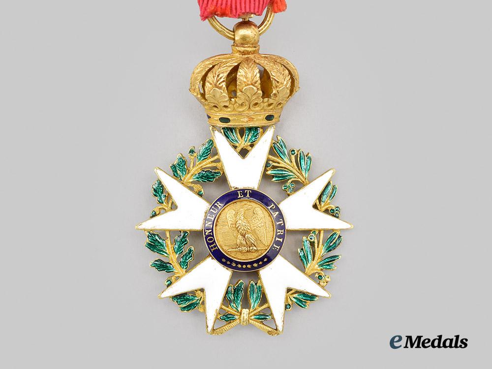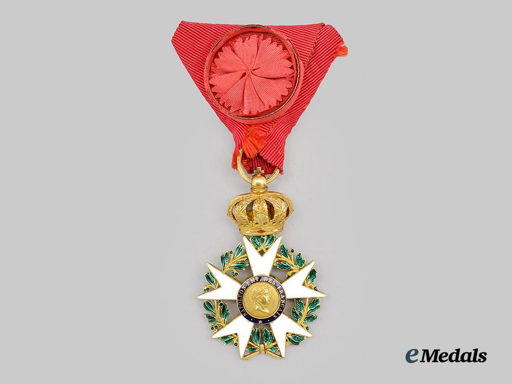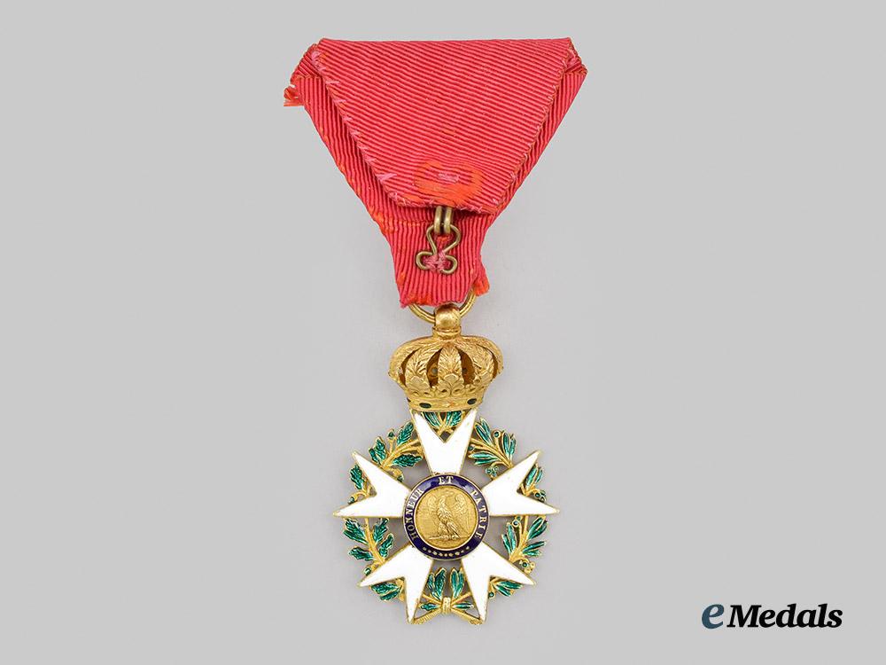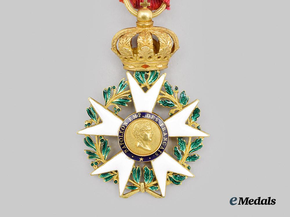 (Ordre national de la Légion d'honneur). Instituted in 1802. Type I (1806-1808). In Gold, a beautiful Legion of honour with five with enamelled Maltese arms, the green enamelled laurel and oak leaf wreath in each quadrant are crisp, the central medallion features a right facing profile of Napoleon, surrounded on a blue enamelled ring inscribed NAPOLEON EMP. DES FRANCOIS, the reverse medallion features a left facing eagle with outstretched wings surrounded by a blue enamelled ring inscribed HONNEUR ET PATRIE, the badge is surmounted by a richly detailed crown with red and green enamel details, marked on the striated ring with a rooster head denoting Paris manufacture from 1809-1819, measures 38.80 mm (w) x 58.00 mm (h – inclusive of cross adorned surmounting crown), weighs 21.91 grams, worn on a replacement ribbon with rosette, small chip evident on reverse of 12 o’clock arm, otherwise, minor enamel wear to the tips of several arms, loss of red enamel to the obverse of the crown band, striated ring bent, an award rarely found in such extremely fine condition.