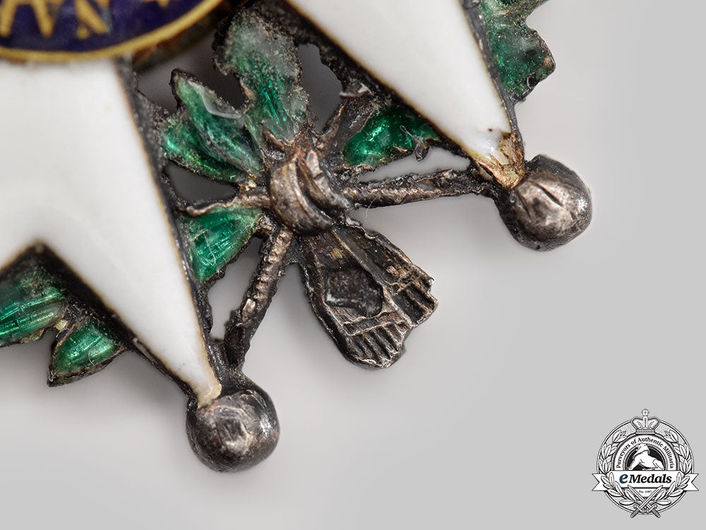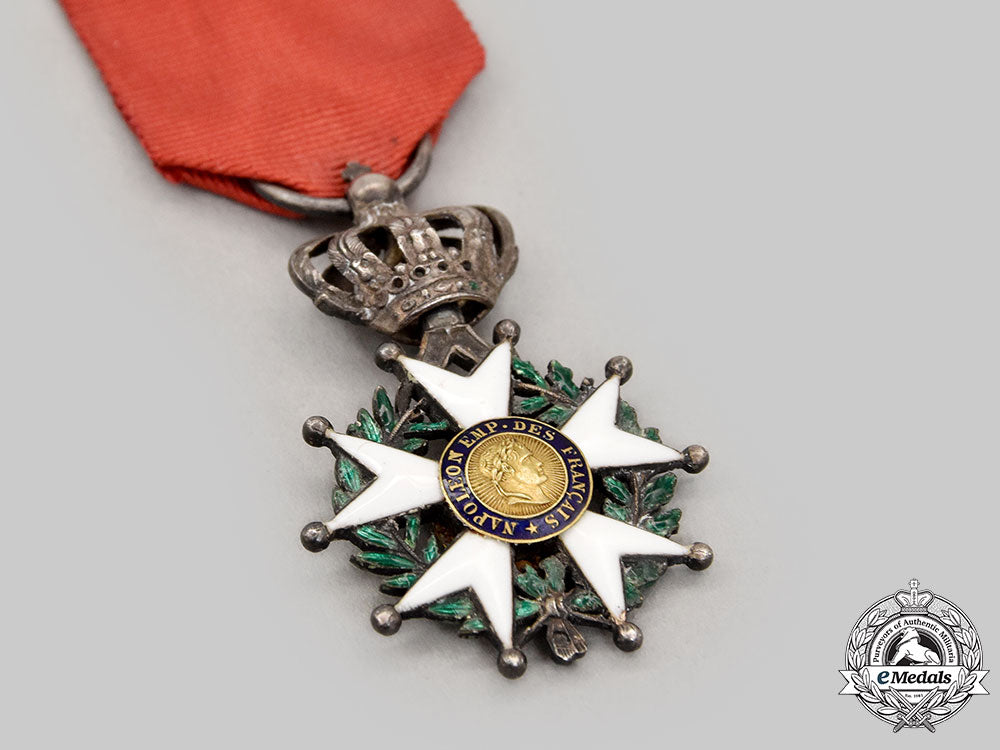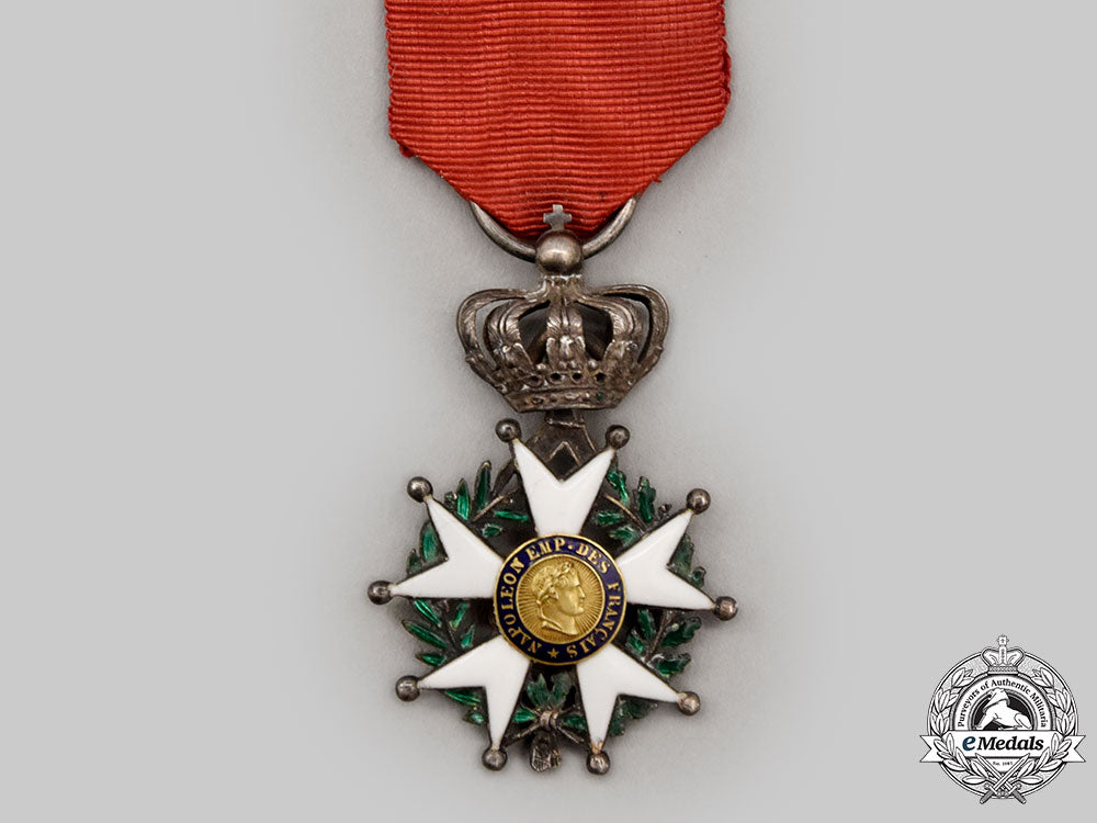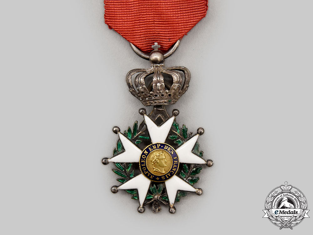 (Ordre de la Légion d'Honneur). Instituted in 1802. Type III (1806-1808). In silver with blue, white and green enamels, both centrepieces in Gold, hallmarked with a rooster on the tip of the ribbon on the obverse, measuring 27.5 mm (w) x 42.3 mm (h) inclusive of its crown and laterally-pierced ball suspension, crazing evident in the white enamels on two arms on the obverse, chipping and loss present on two leaves of the wreath on the reverse, original ribbon, near very fine.